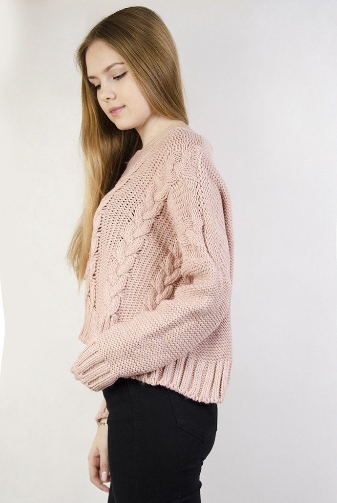 Krótki różowy sweter z przeplatanymi warkoczami.