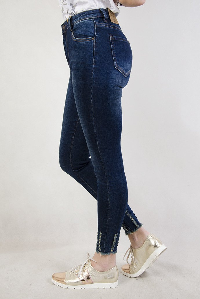 Ciemne spodnie jeansowe z wysokim stanem oraz szarpaniami przy nogawce.