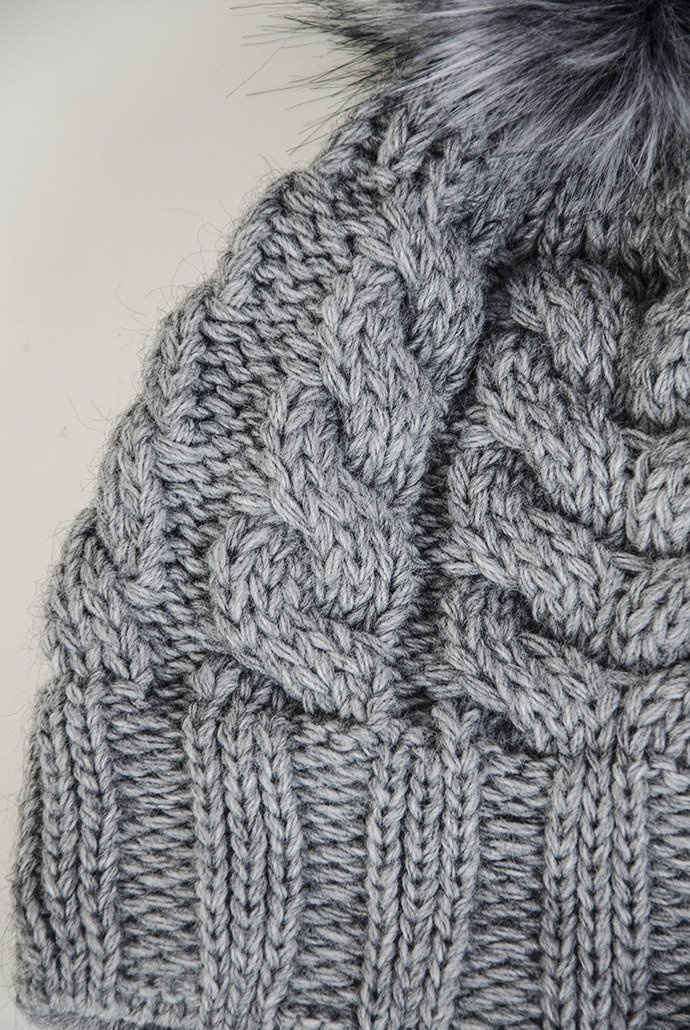 Jasnoszara czapka z pomponem, pleciona warkoczem