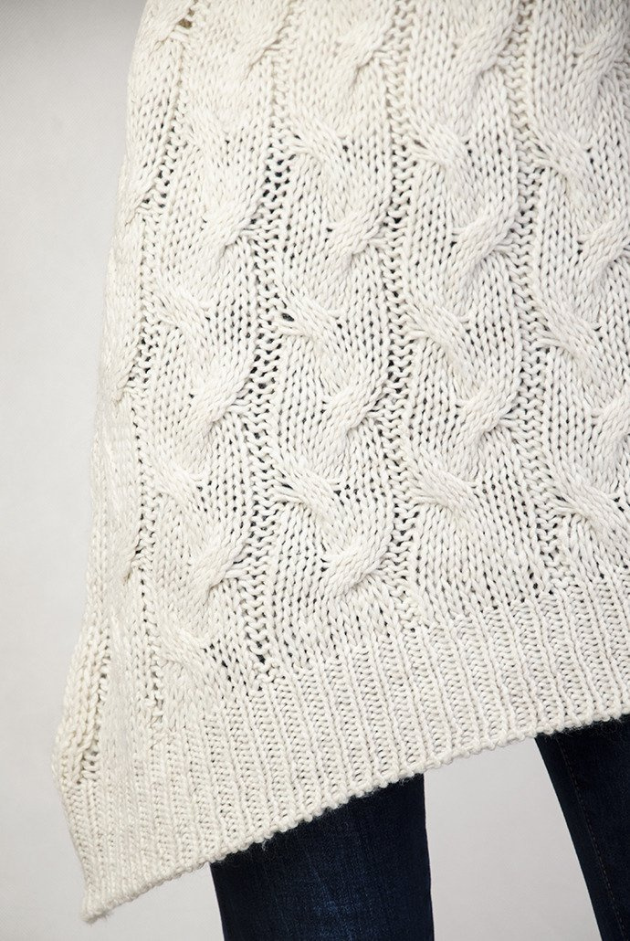 Sweter beżowy o grubym splocie z dłuższym bokiem.