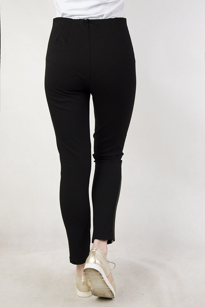 Czarne materiałowe spodnie z  biało-zielonymi paskami po bokach.