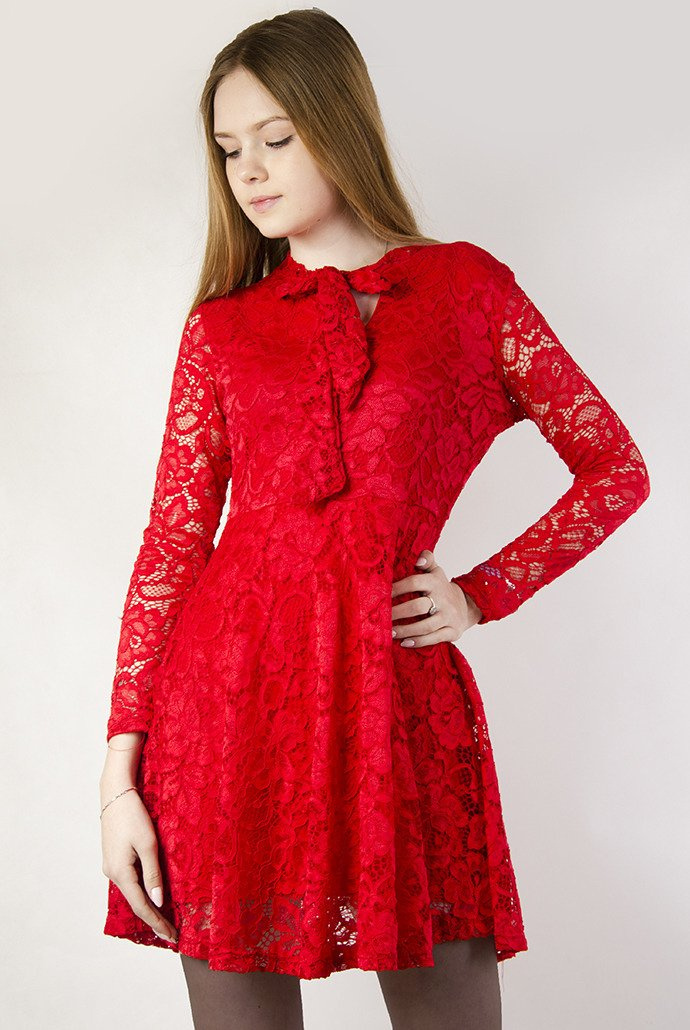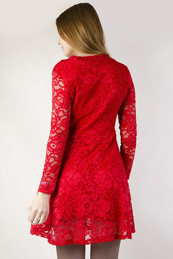 Czerwona rozkloszowana sukienka, cała z koronki z wiązaniem pod szyją.