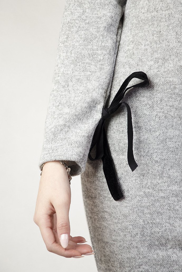 Szara prosta sukienka z koronką na ramionach oraz golfem