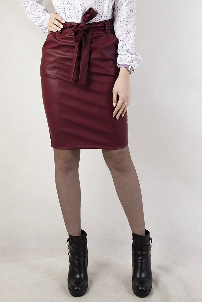 Bordowa ołówkowa spódnica skórkowa  z kieszeniami oraz paskiem