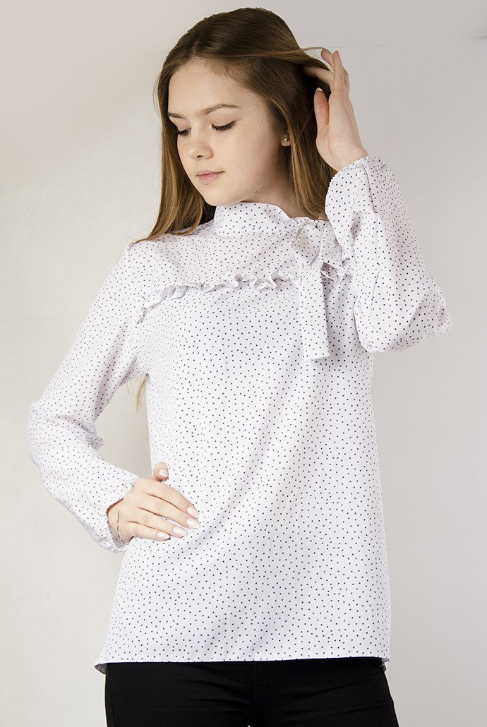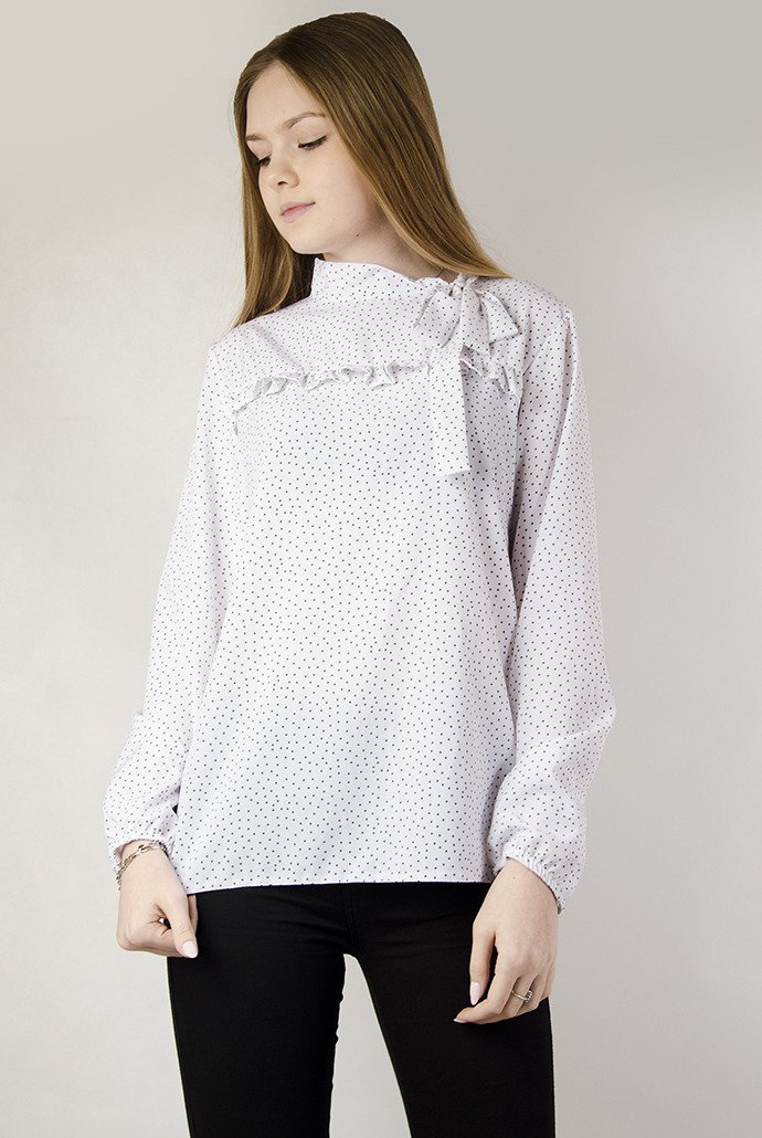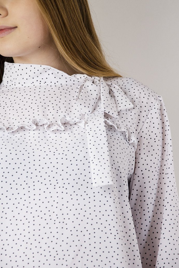Biała bluzka koszulowa w szare kropki z wiązaniem w dekolcie