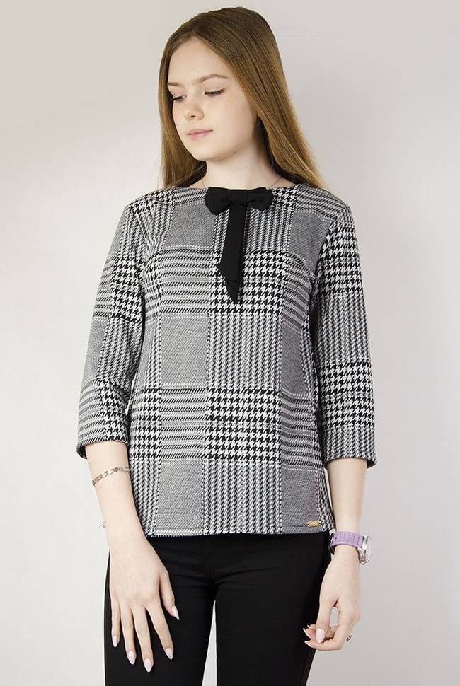 Bluzka w pepitkę z czarną kokardą przy dekolcie