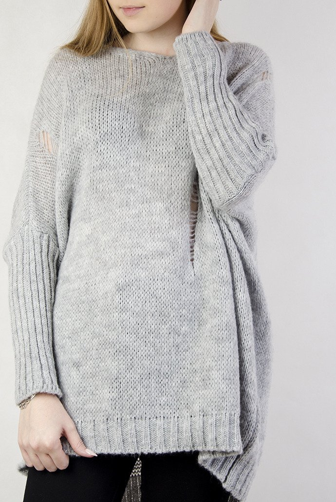 Szary sweter oversize z dziurami oraz dekoltem w serek.