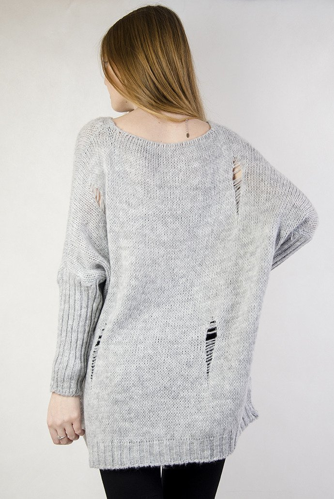 Szary sweter oversize z dziurami oraz dekoltem w serek