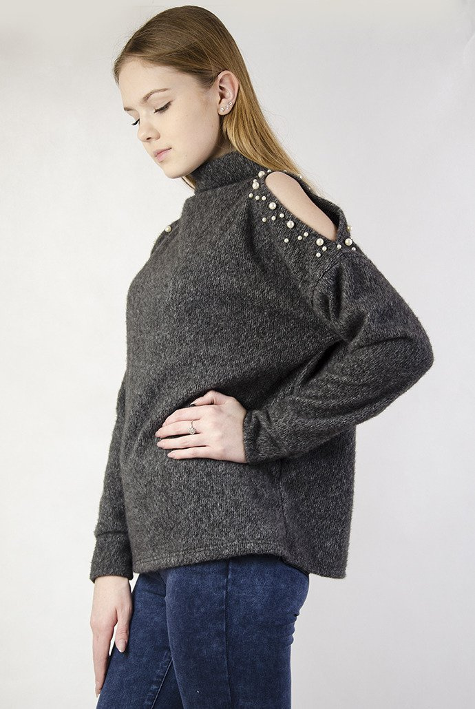 Ciemnoszary sweterek z odkrytymi ramionami oraz perełkami.