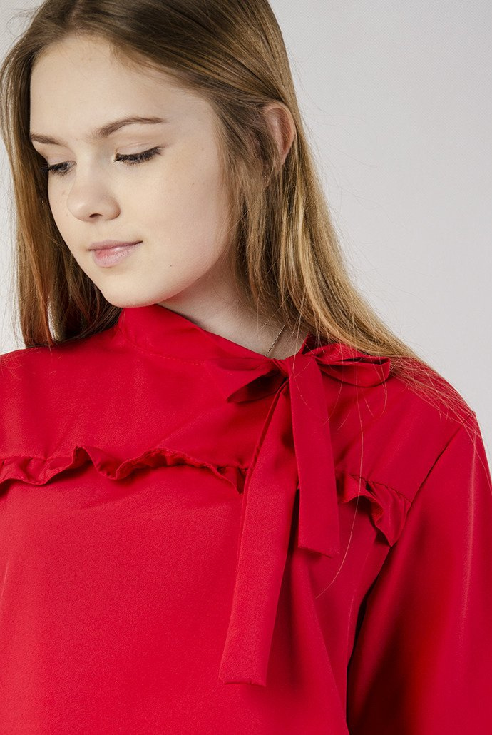 Czerwona bluzka koszulowa z falbanką oraz wiązaniem przy szyi