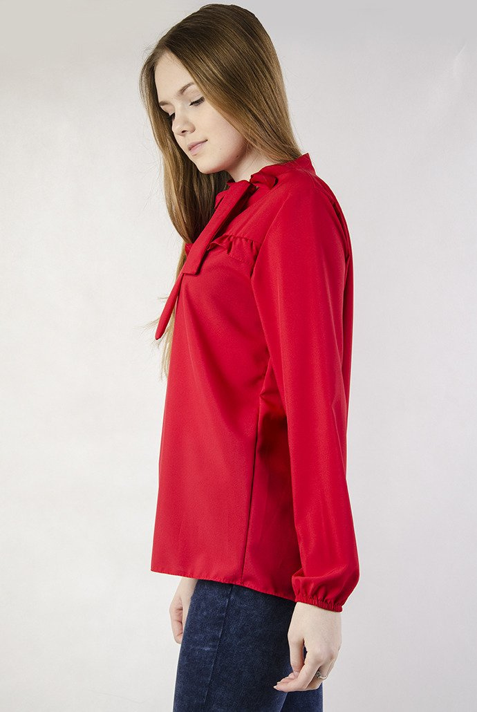 Czerwona bluzka koszulowa  z falbanką oraz wiązaniem przy szyi