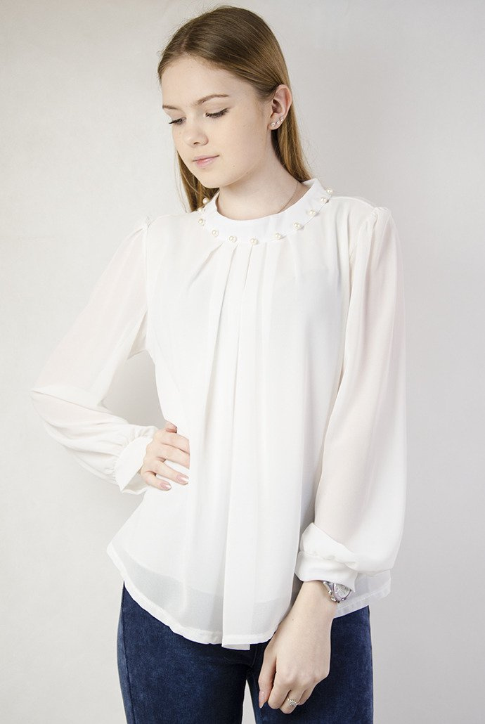 Biała bluzka z koralikami przy dekolcie