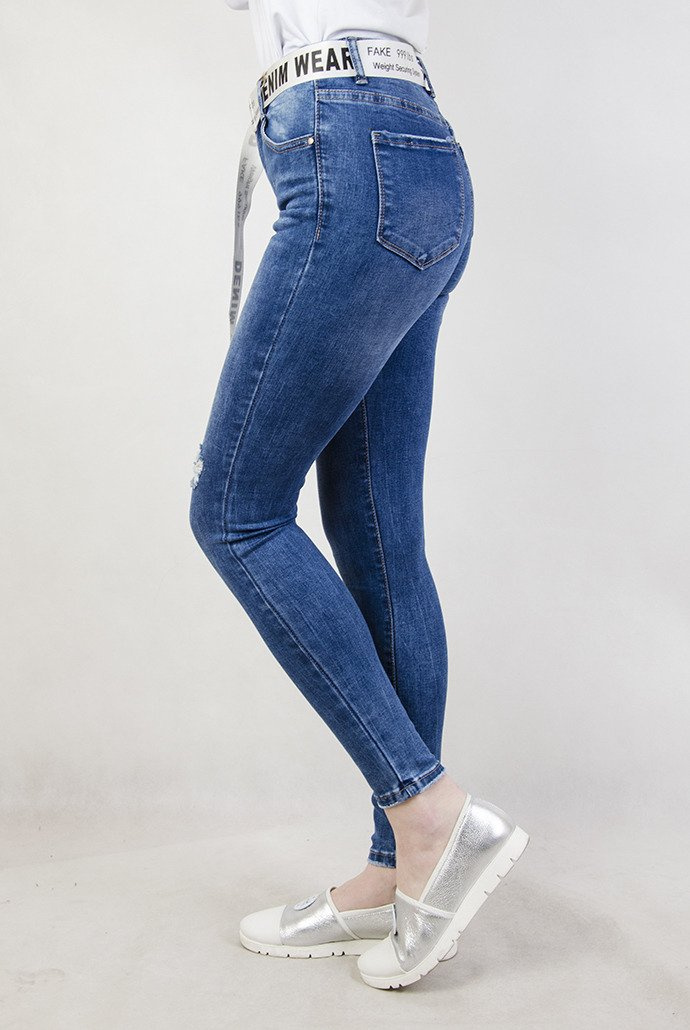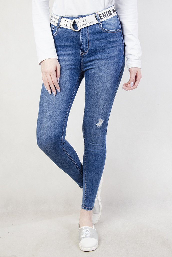 Spodnie jeansowe z wysokim stanem oraz białym paskiem