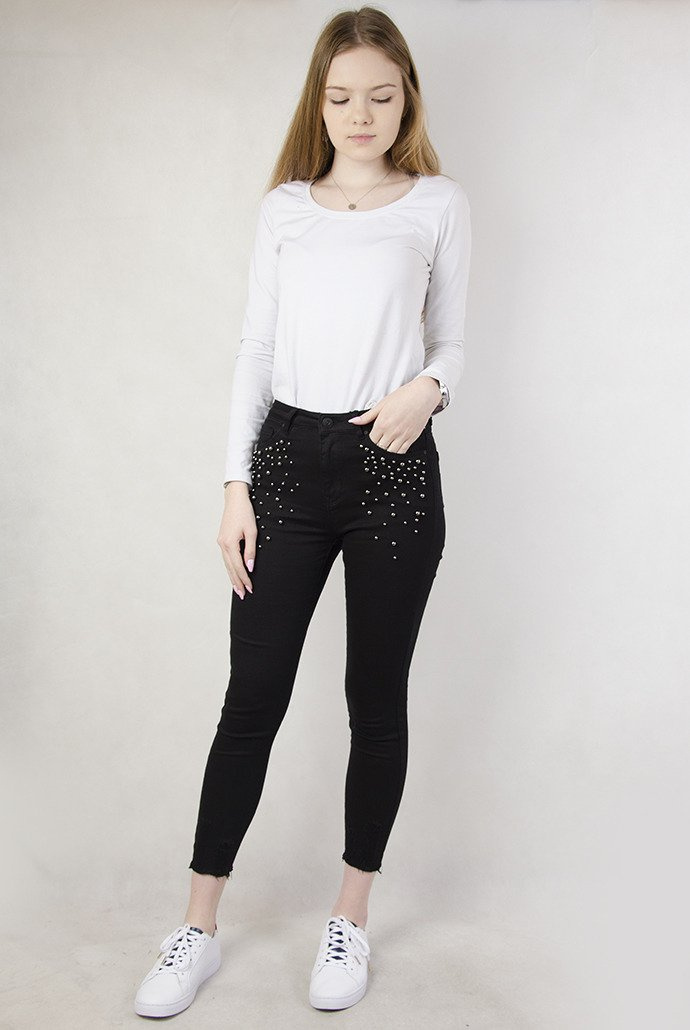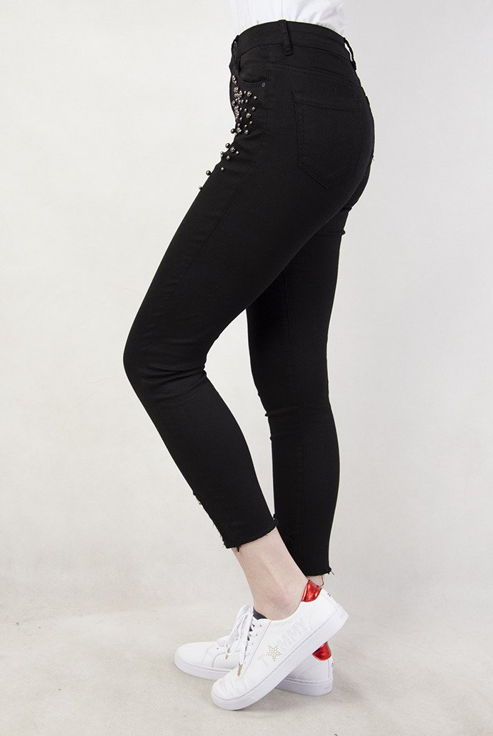 Czarne spodnie jeansowe z koralikami i przetarciami