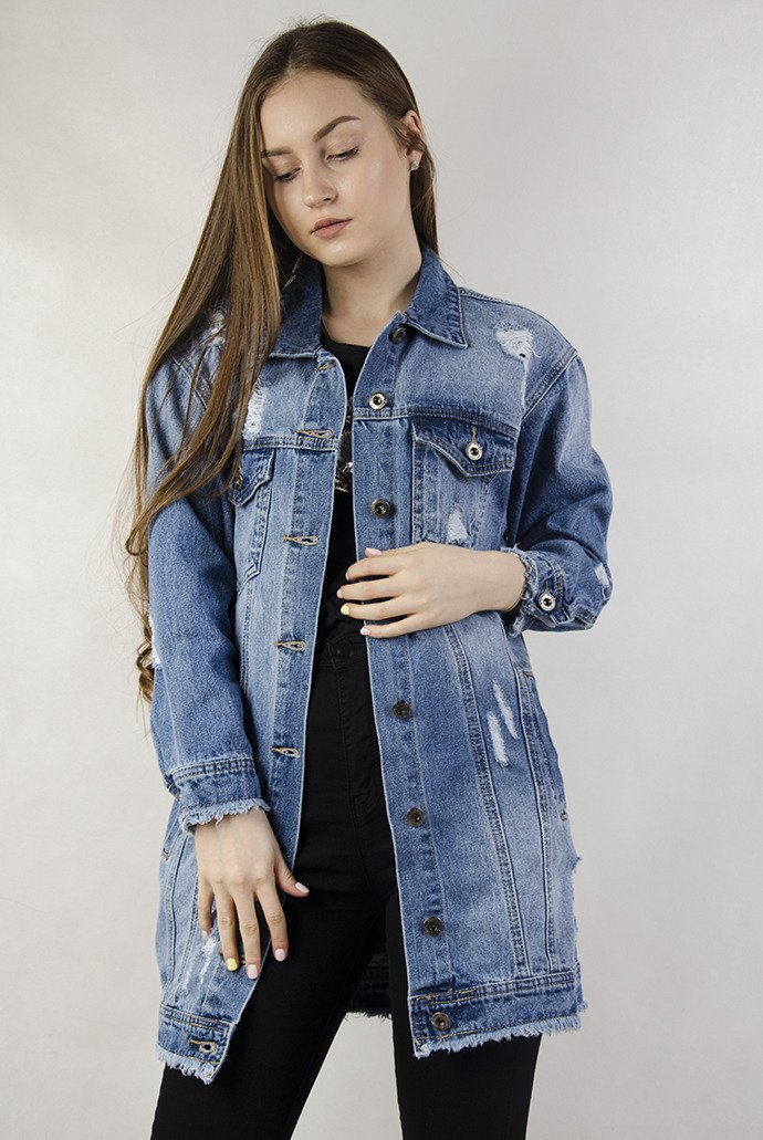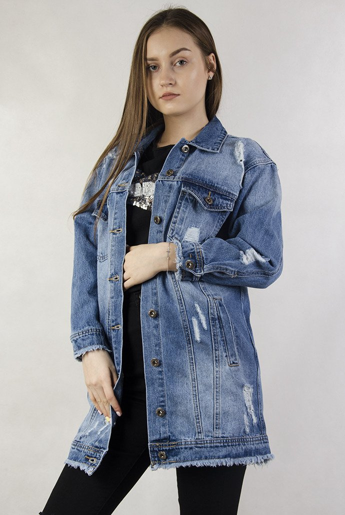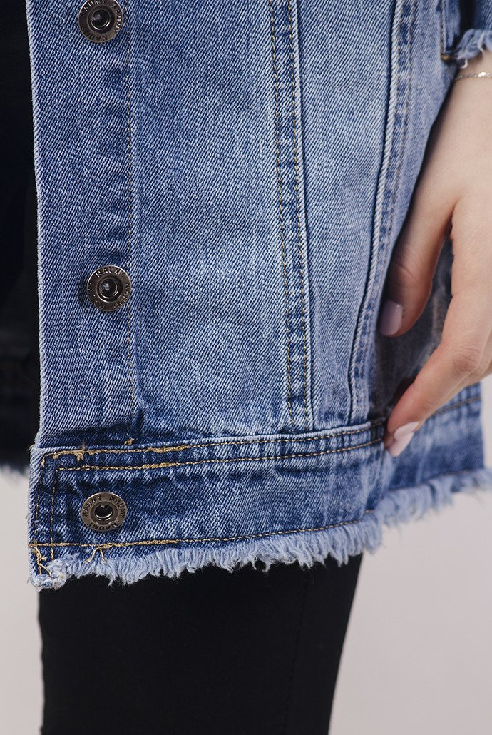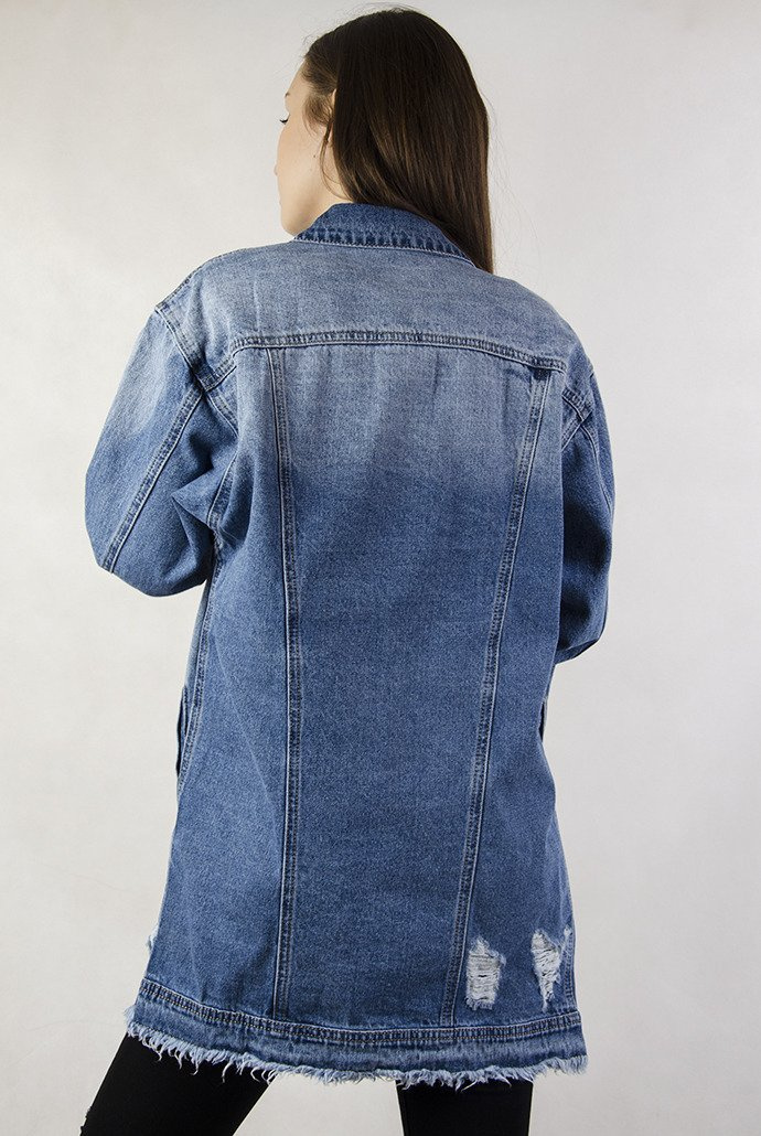 Ciemna kurtka jeansowa przedłużana z szarpaniem na dole