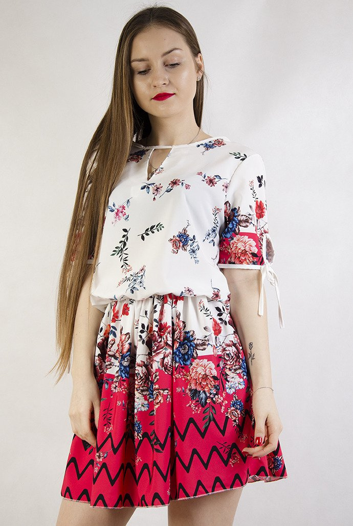 Biała sukienka z motywem kwiatowym z gumką w pasie