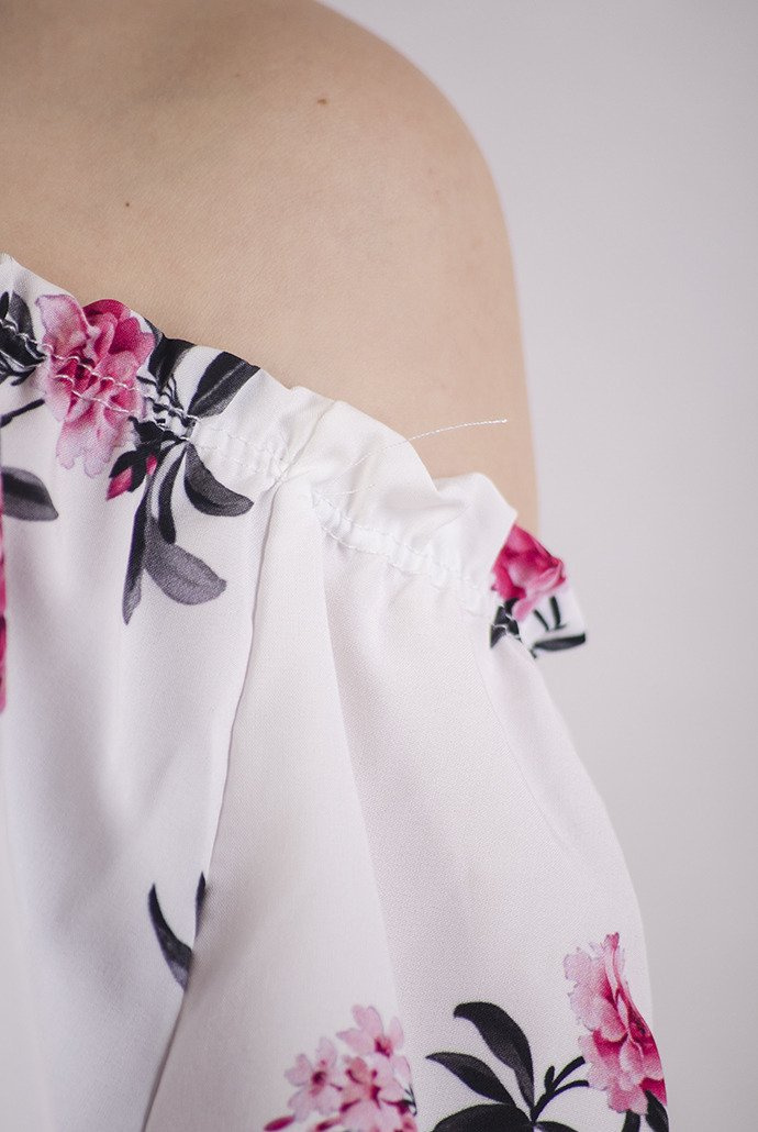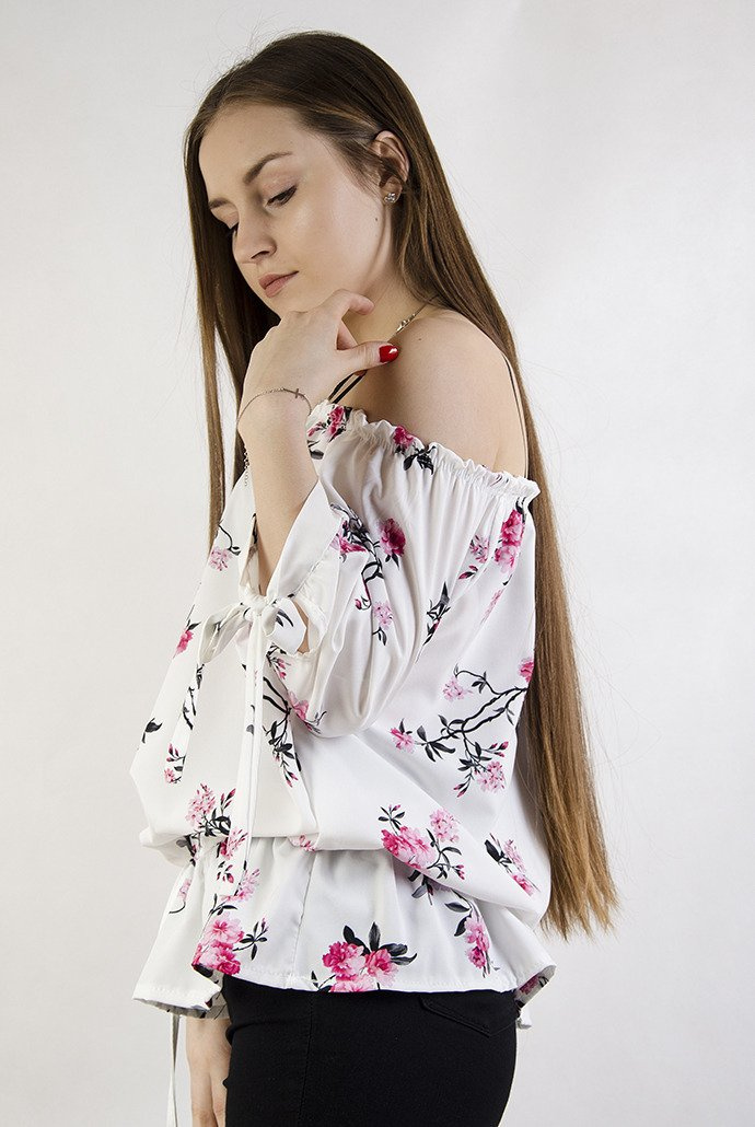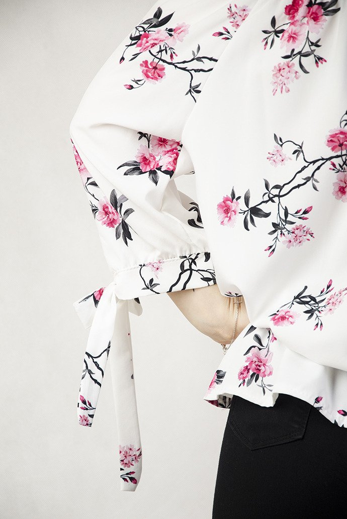Biała bluzka w kwiaty z hiszpańskim dekoltem