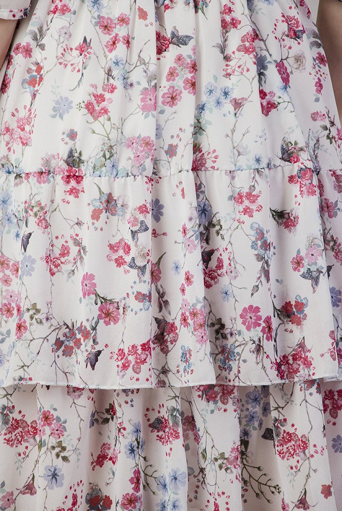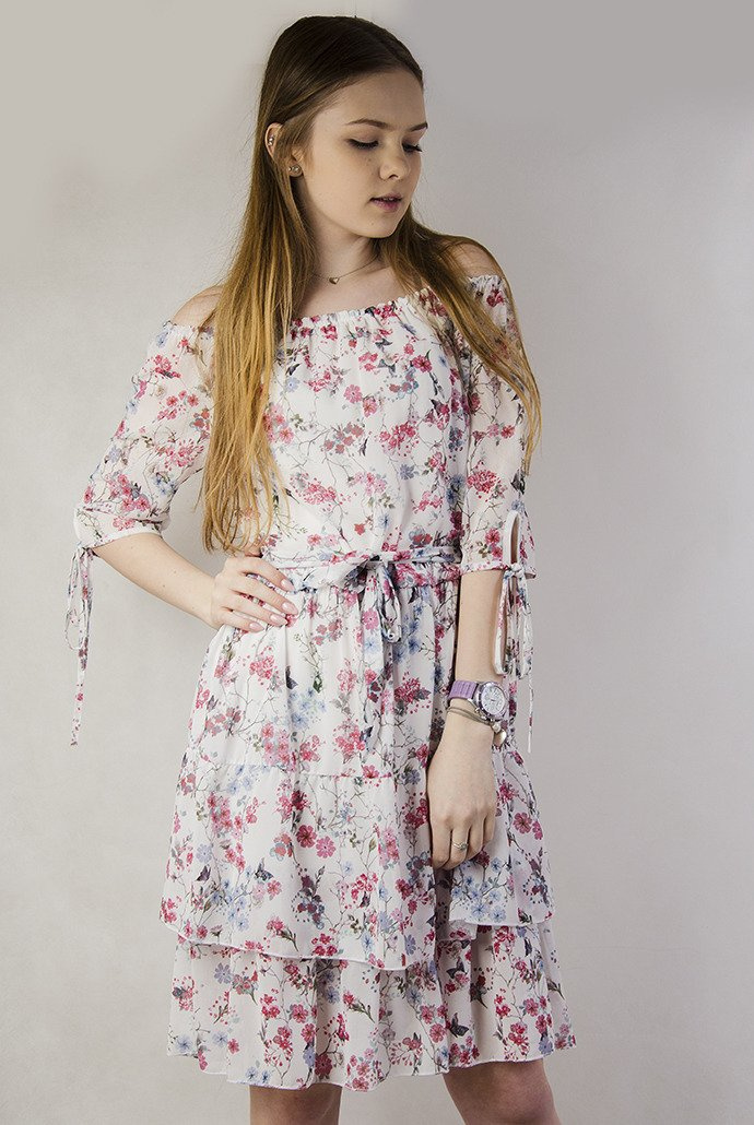 Biała sukienka w kwiaty z wiązaniem w pasie
