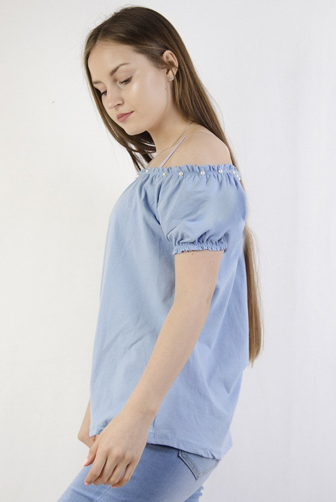 Niebieska bluzka hiszpanka z perełkami