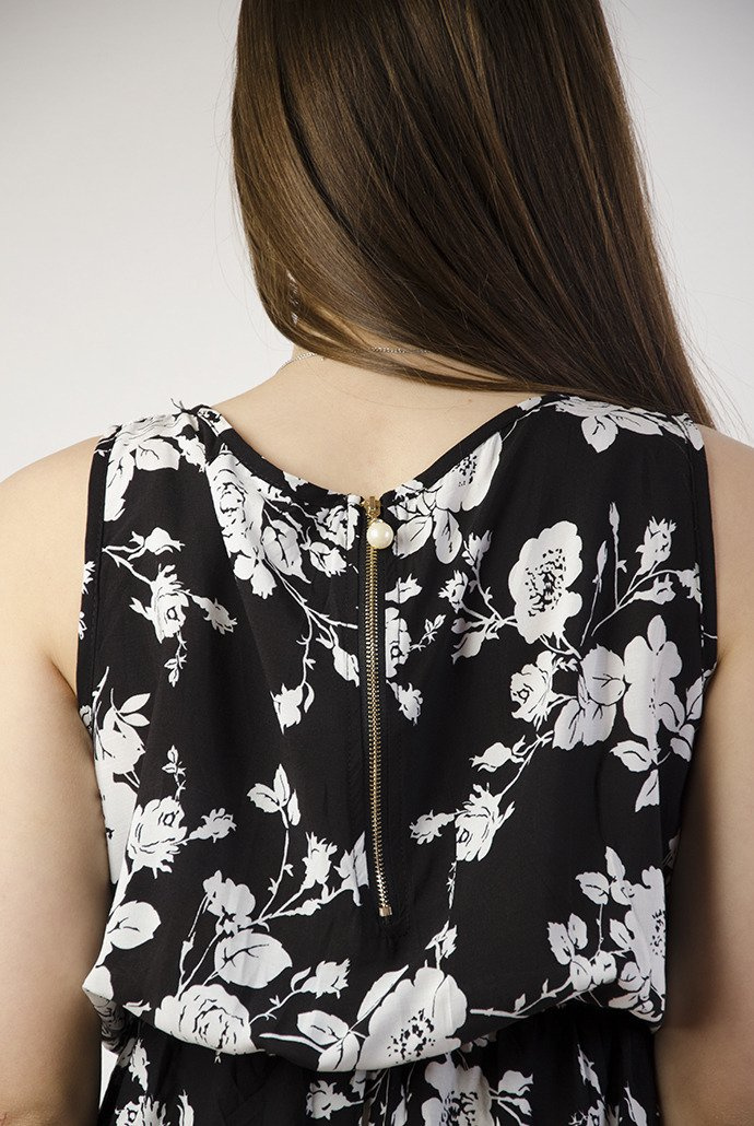 Czarna sukienka w białe kwiaty z zamkiem z tyłu,