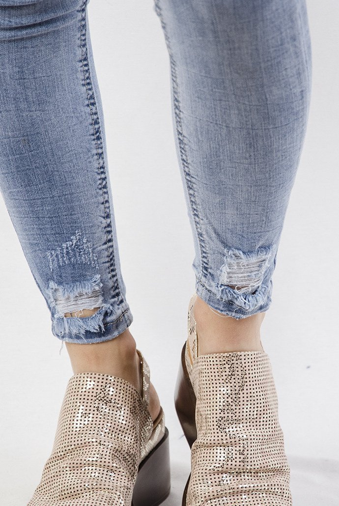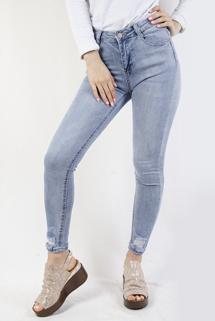 Jasne spodnie jeansowe z przetarciami na dole nogawki