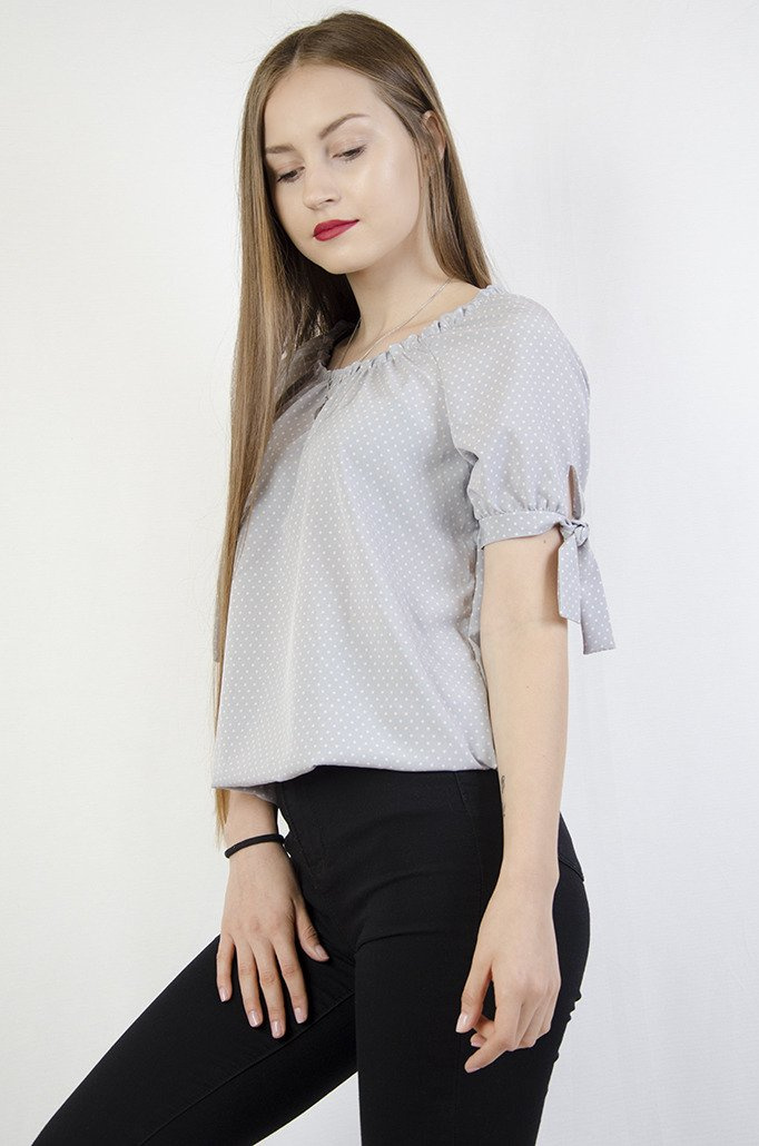 Szara bluzka w kropki z marszczeniem przy dekolcie