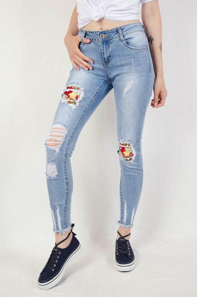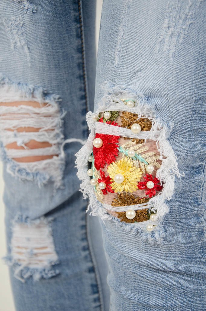 SPODNIE JEANSOWE Z KWIATOWYM HAFTEM