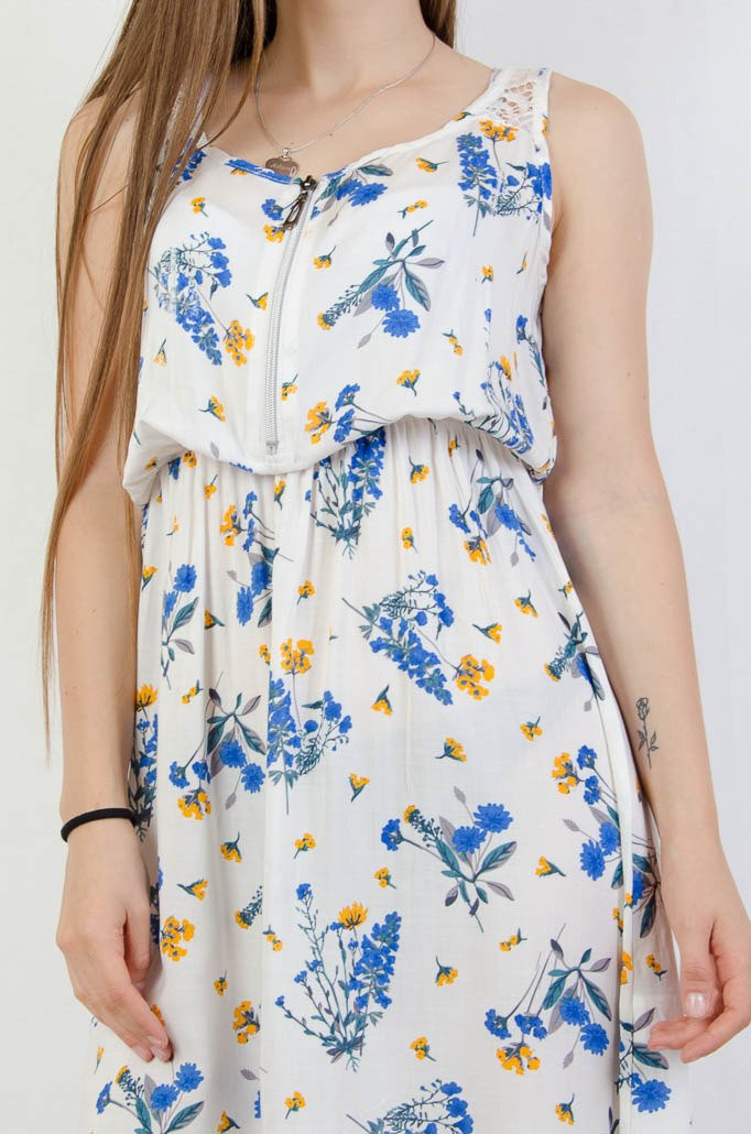 Zwiewna biało niebieska sukienka z gumką w pasie