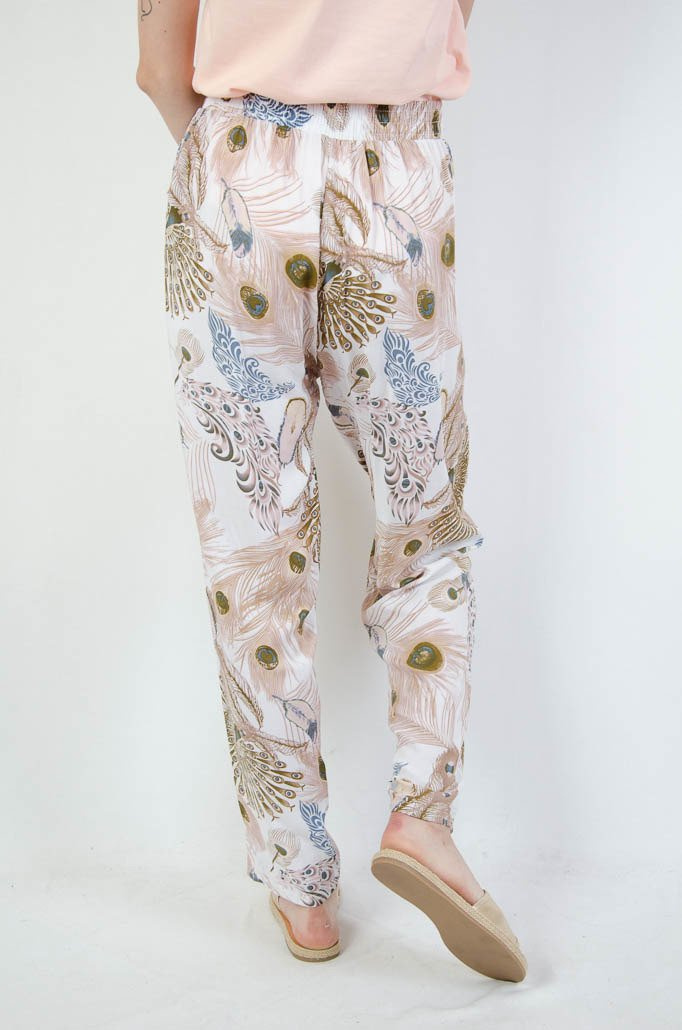 Białe spodnie alladynki z motywem pawiego oka