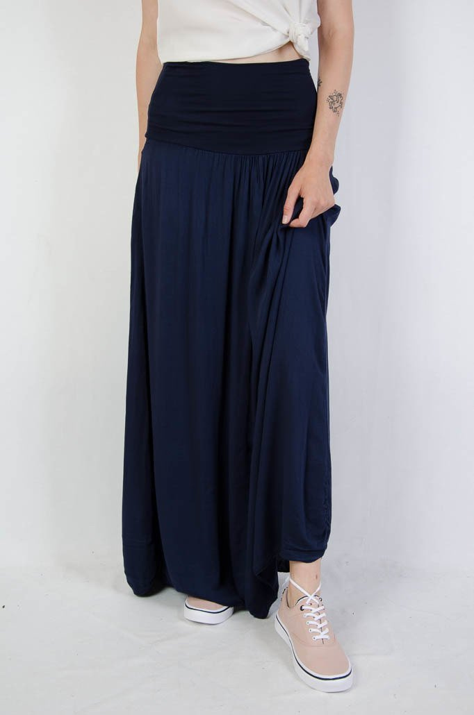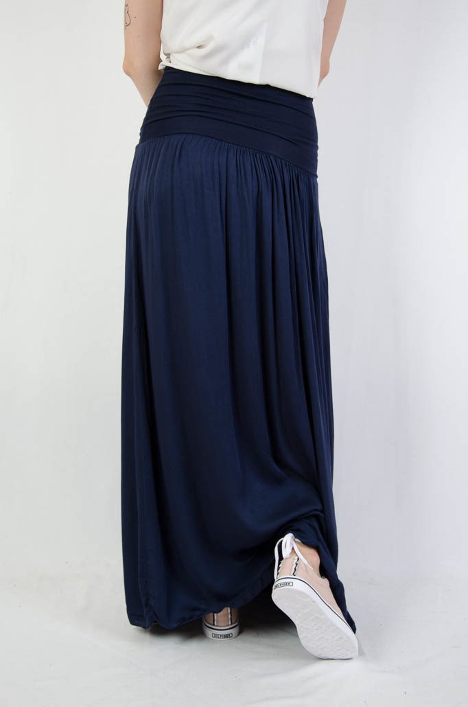 Długa zwiewna granatowa spódnica z szerokim pasem