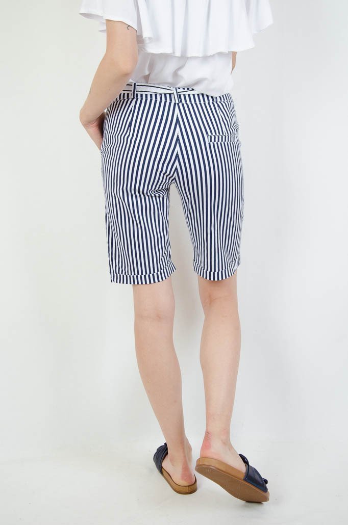 BERMUDY W BIAŁO GRANATOWE PASY Z KOKARDĄ W PASIE