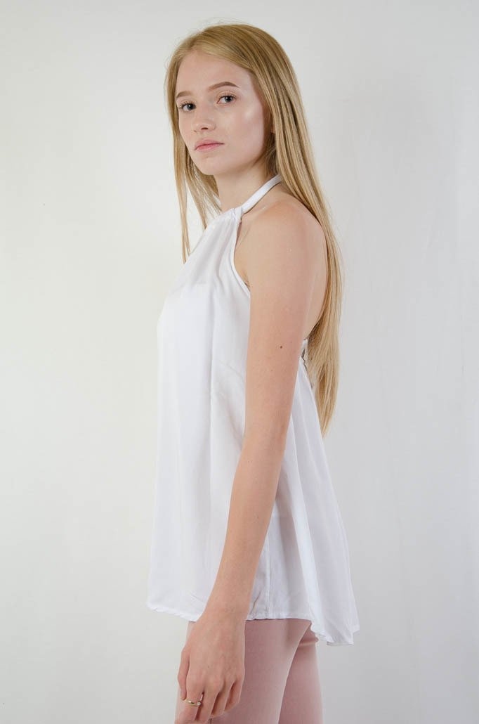 Biały luźny top z wiązaniem na szyi oraz odkrytymi plecami