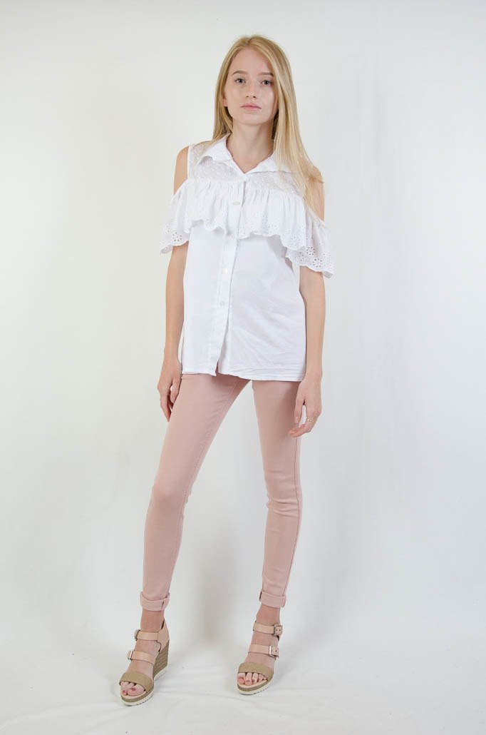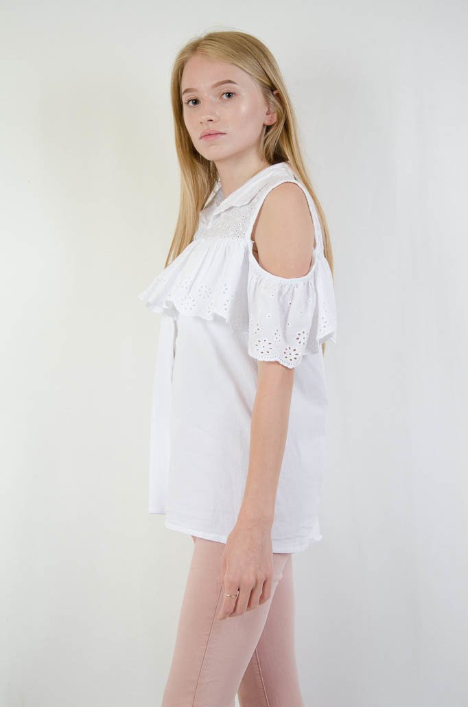 Biała bluzka z kołnierzykiem oraz odkrytymi ramionami