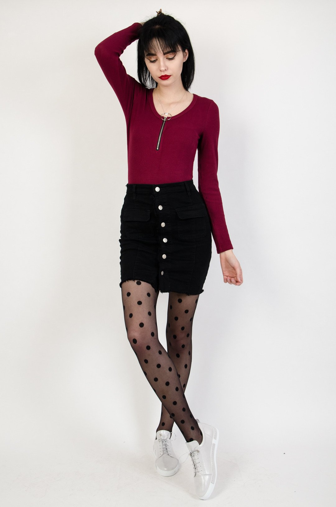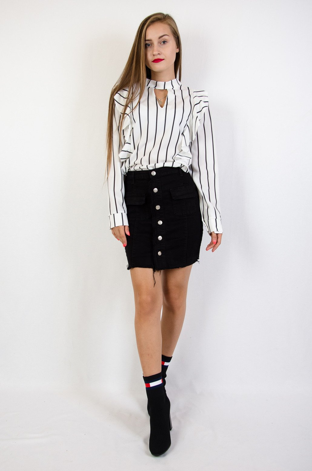 Czarna spódniczka jeansowa zapinana na guziki oraz kieszeniami z przodu i z tyłu.