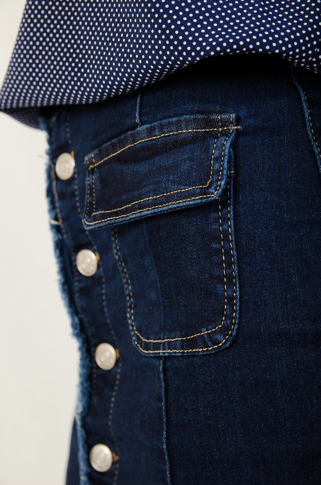 Granatowa spódniczka jeansowa zapinana na guziki oraz kieszeniami z przodu i z tyłu.
