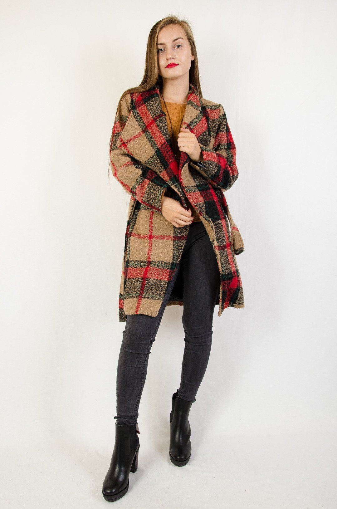 Beżowy płaszcz w kratę, z wiązaniem w pasie oraz guzikiem przy szyi