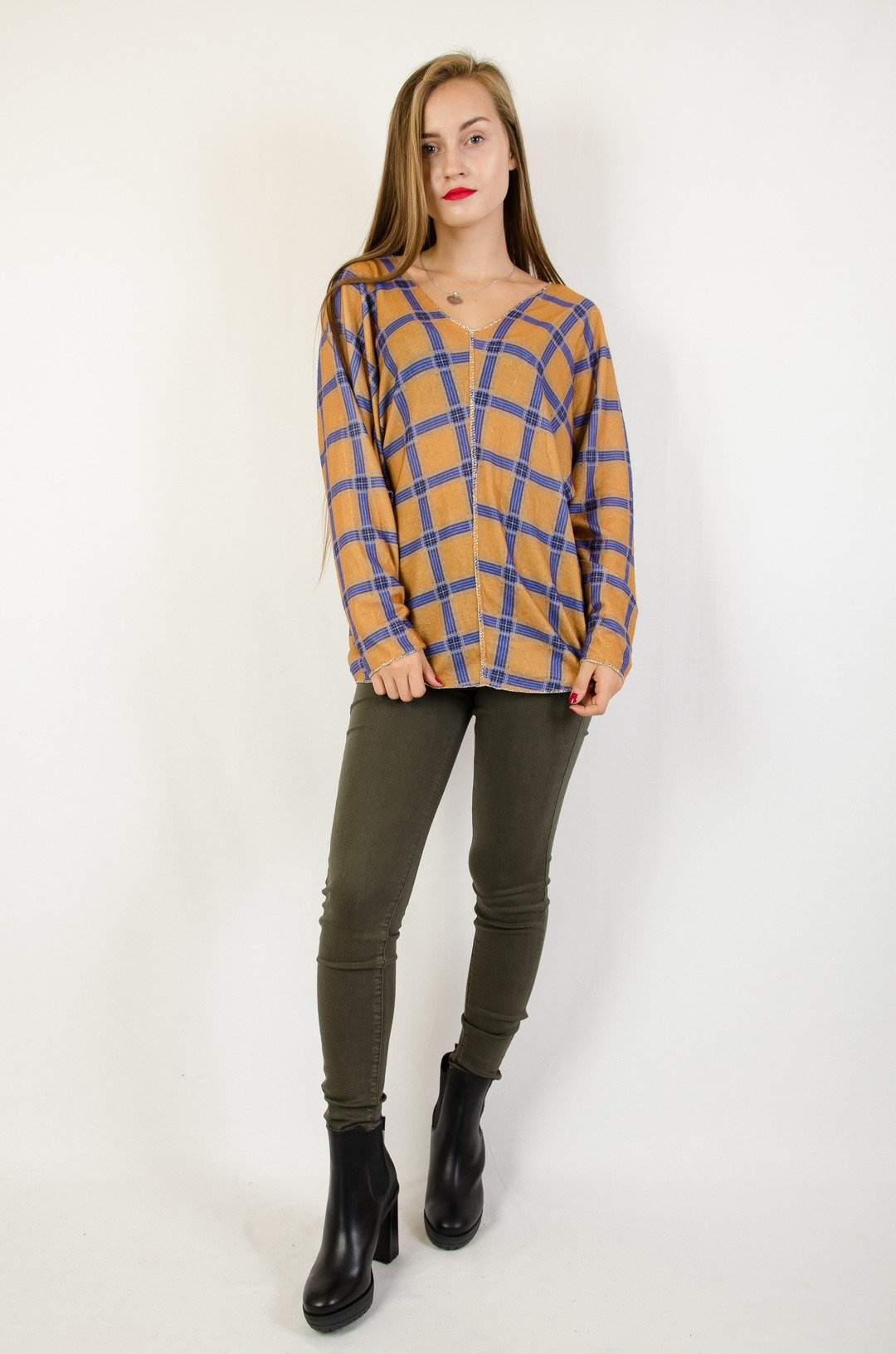 Musztardowa bluzka typu nietoperz w niebieska kratę.