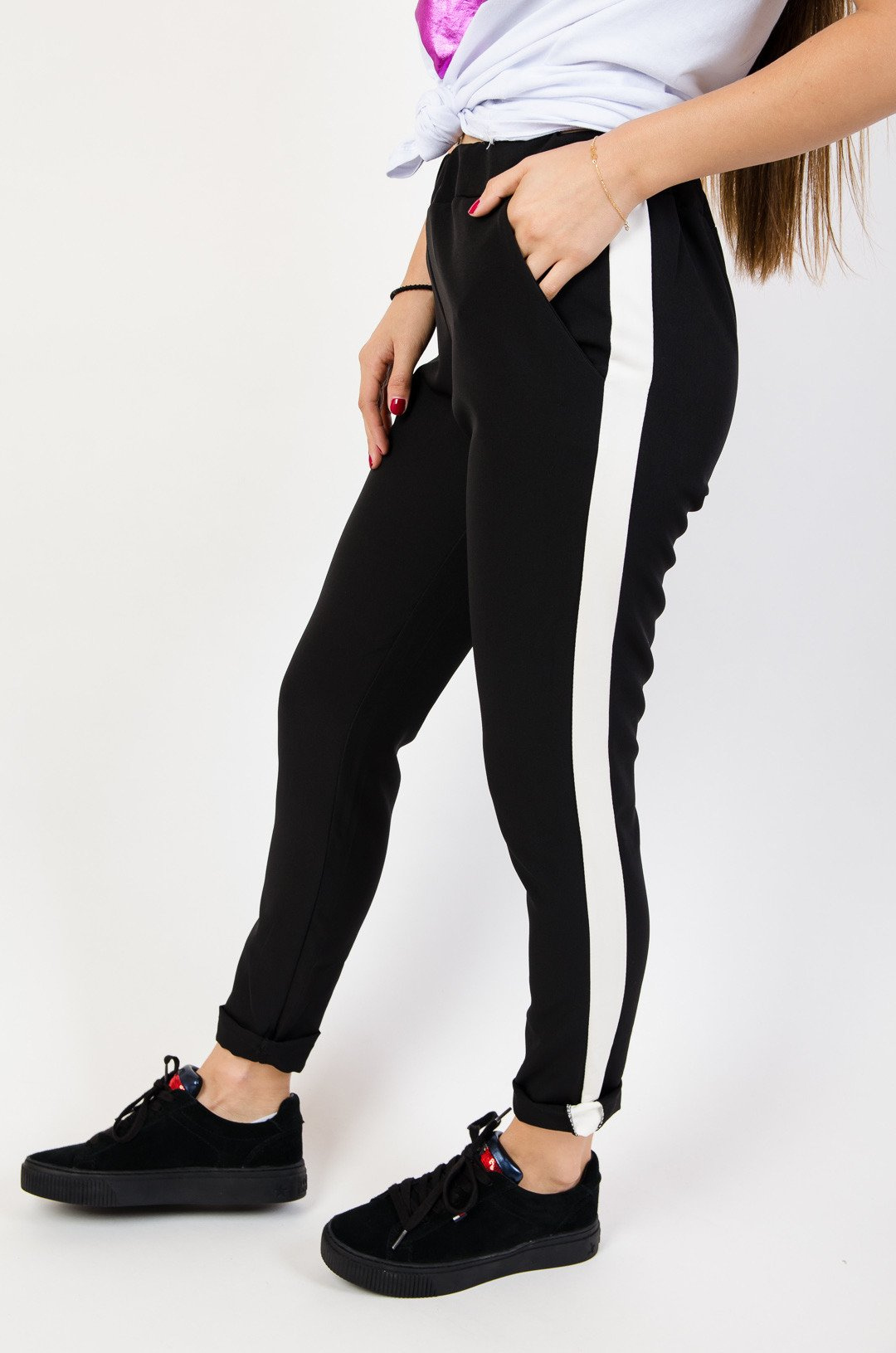 Czarne spodnie z białymi lampasami oraz gumką w pasie
