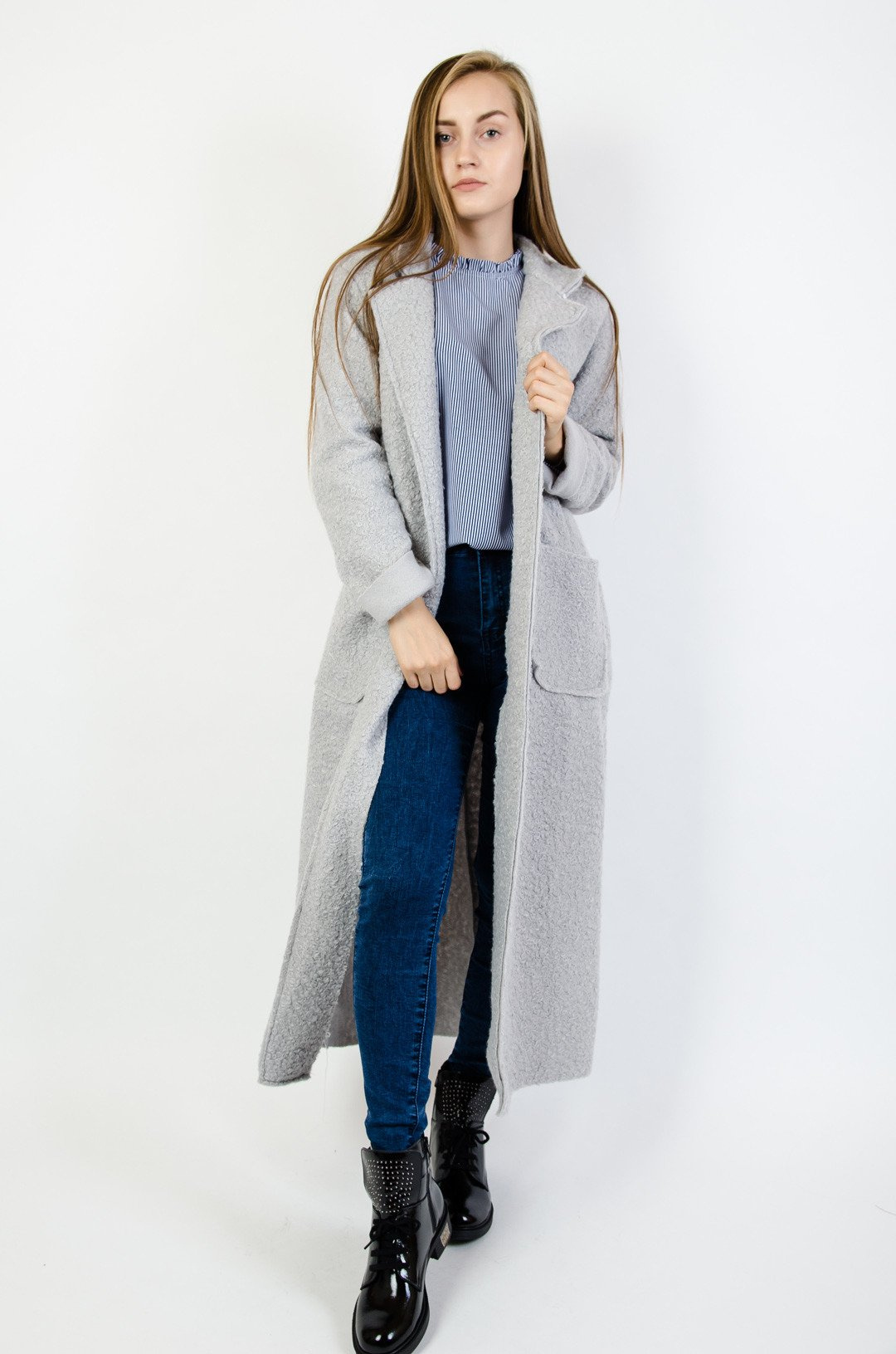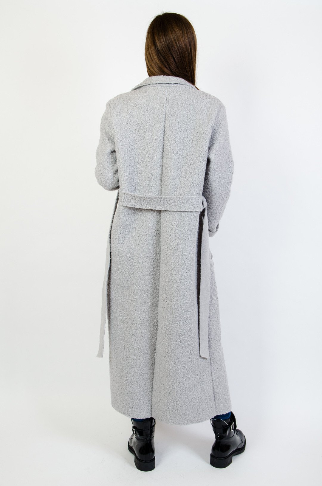 Szary płaszcz wiązany w pasie