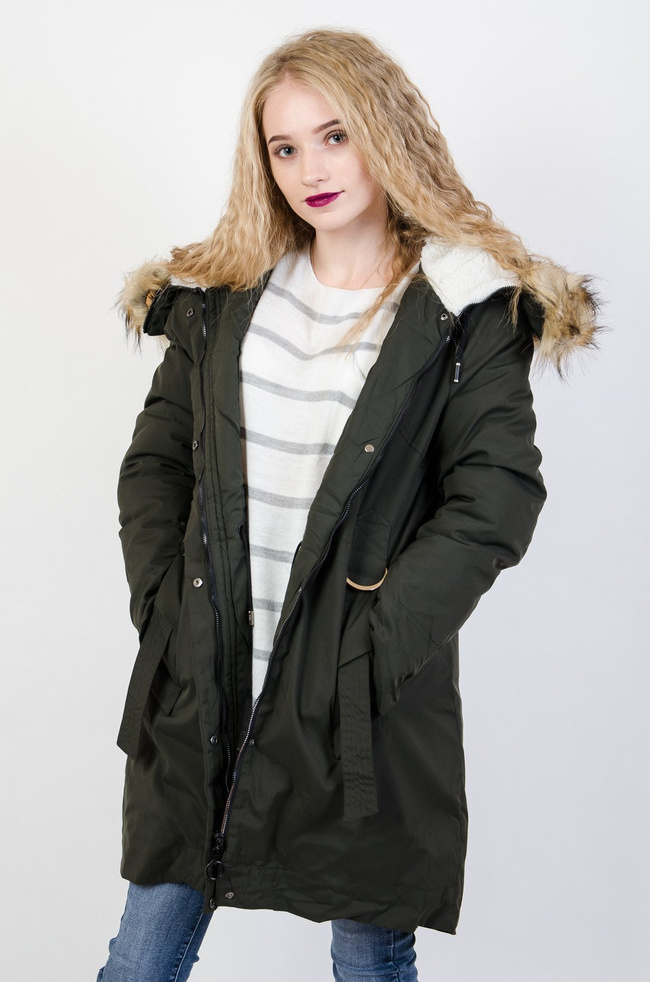 Zielona kurtka ocieplana ze ściągaczem w tali. Możliwe jest odpięcie futerka przy kapturze.