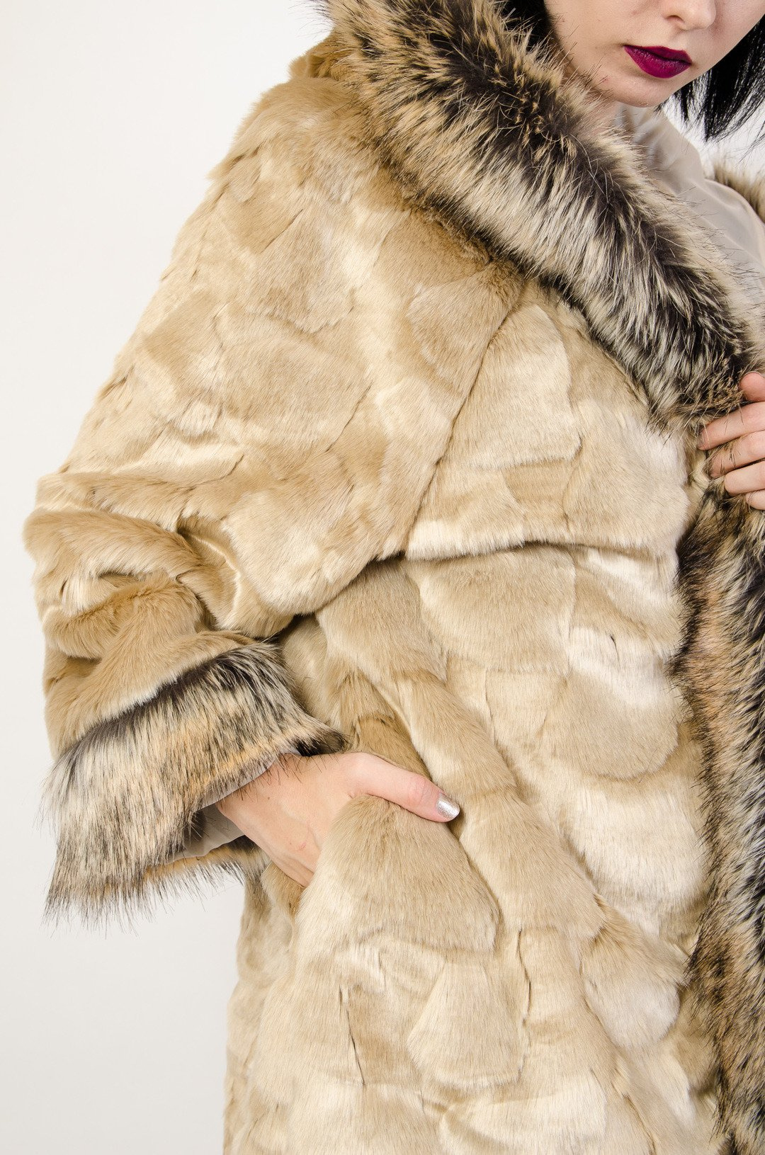 Beżowe sztuczne futro z kapturem.
