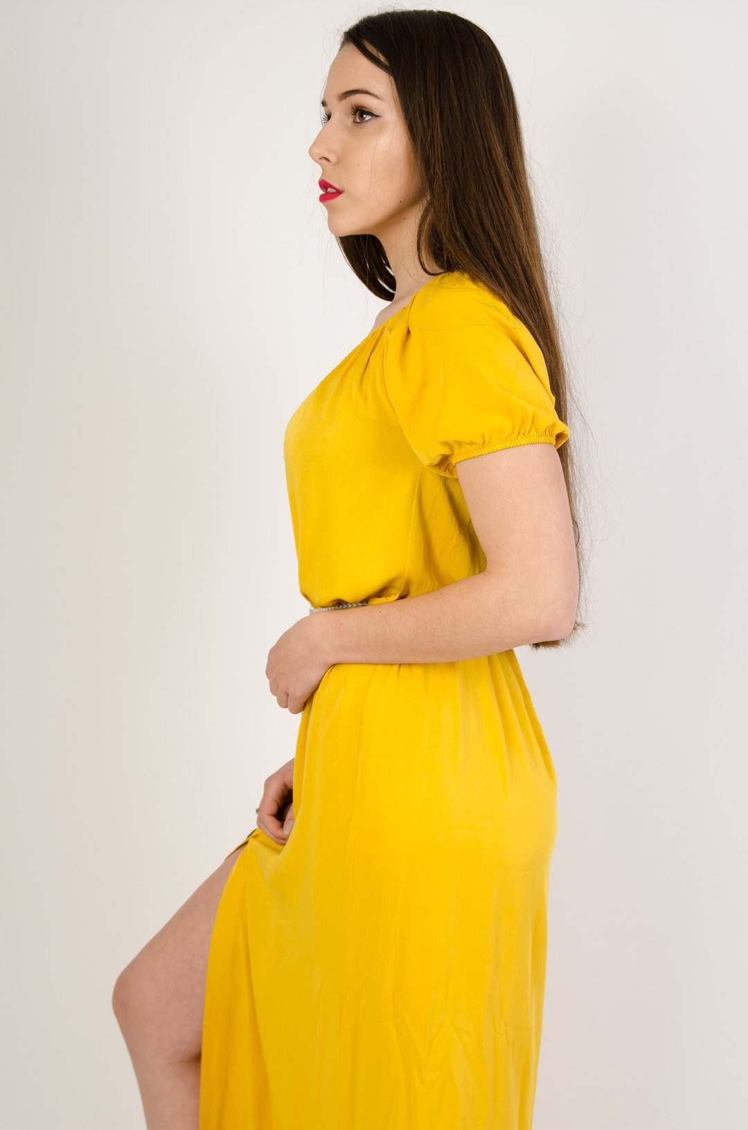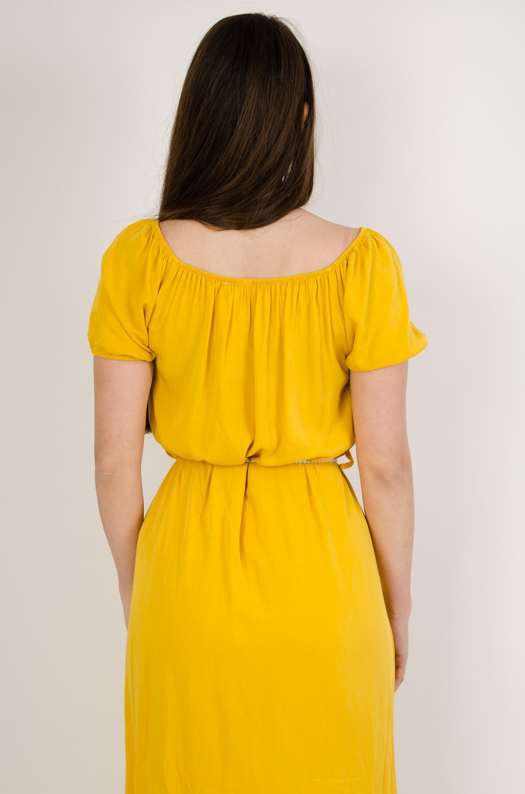 Żółta sukienka zapinana na guziki, wiązana w pasie