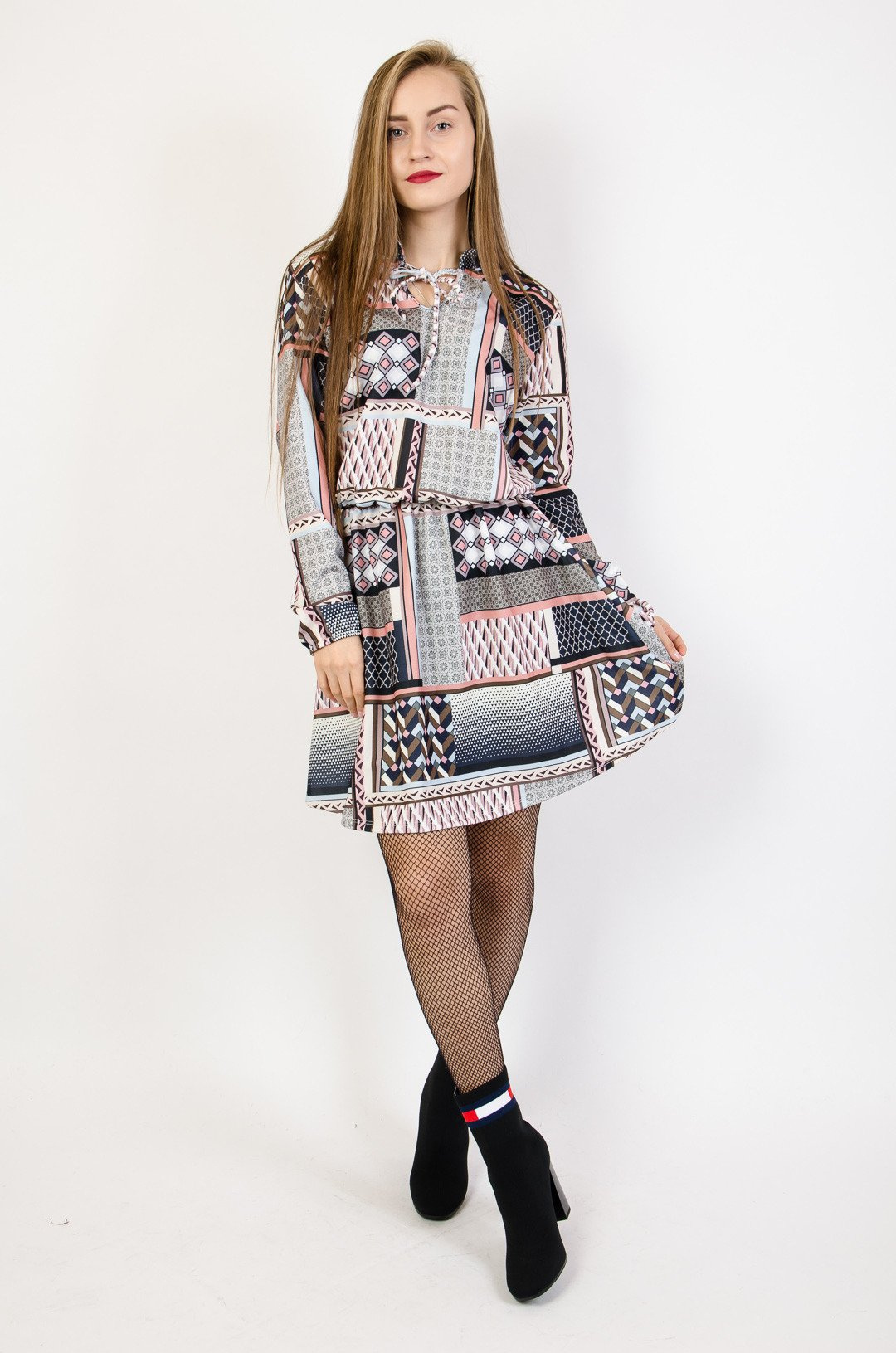 Wzorzysta sukienka z gumką w pasie oraz wiązaniem w dekolcie