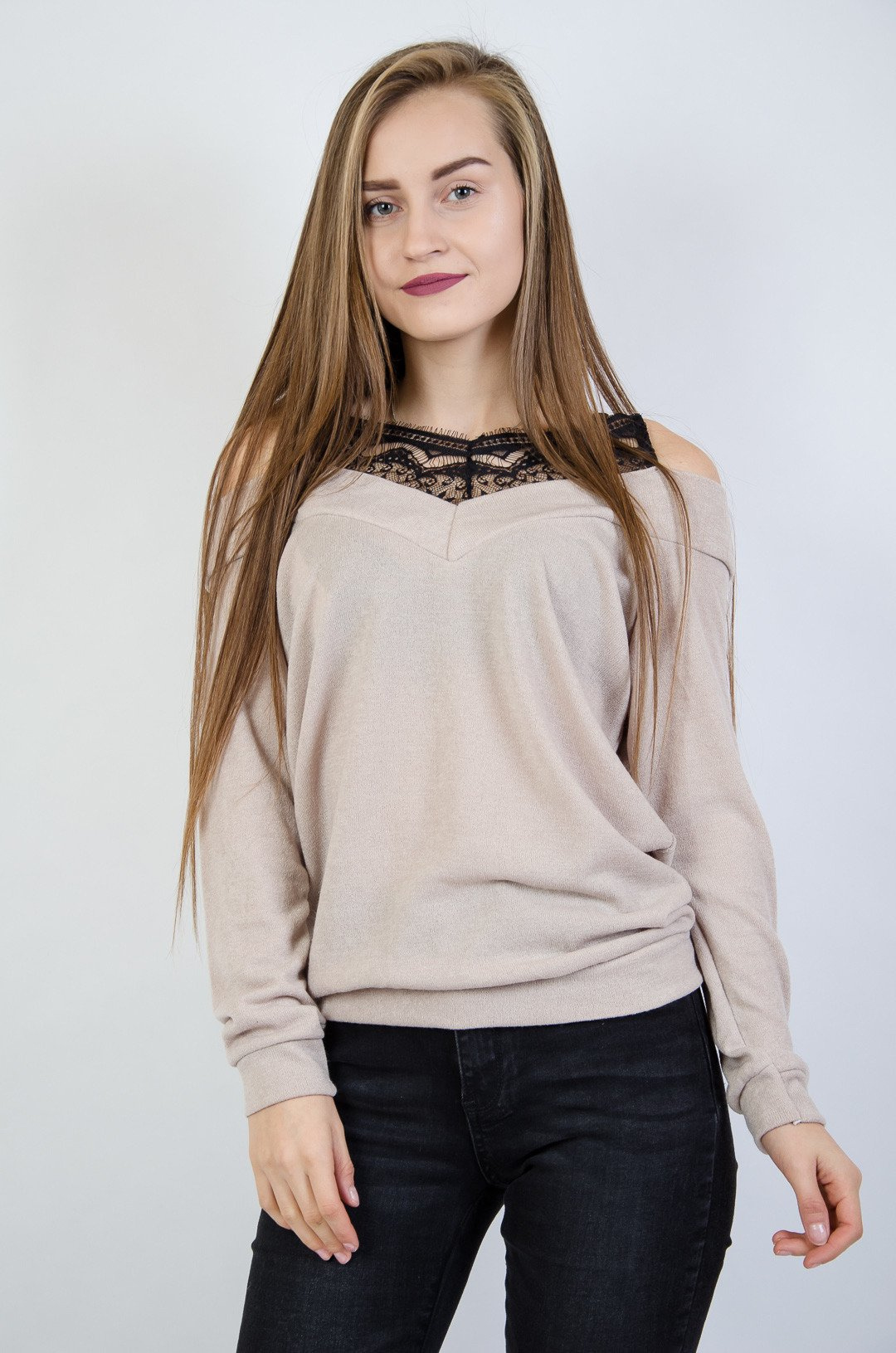 Beżowa dzianinowa bluzka z wstawkami z koronki