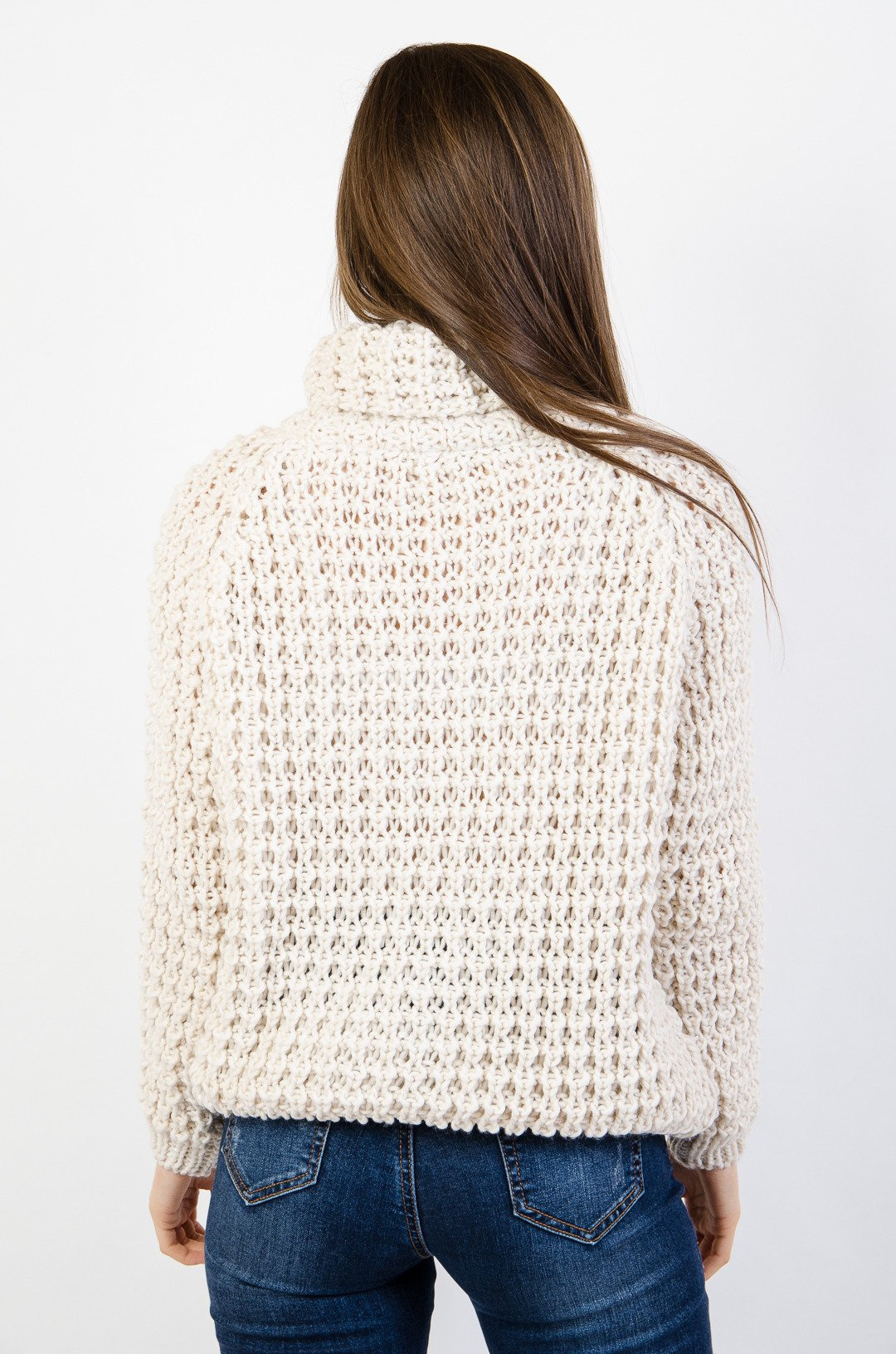 Beżowy sweter z golfem przeplatany srebrną nicią