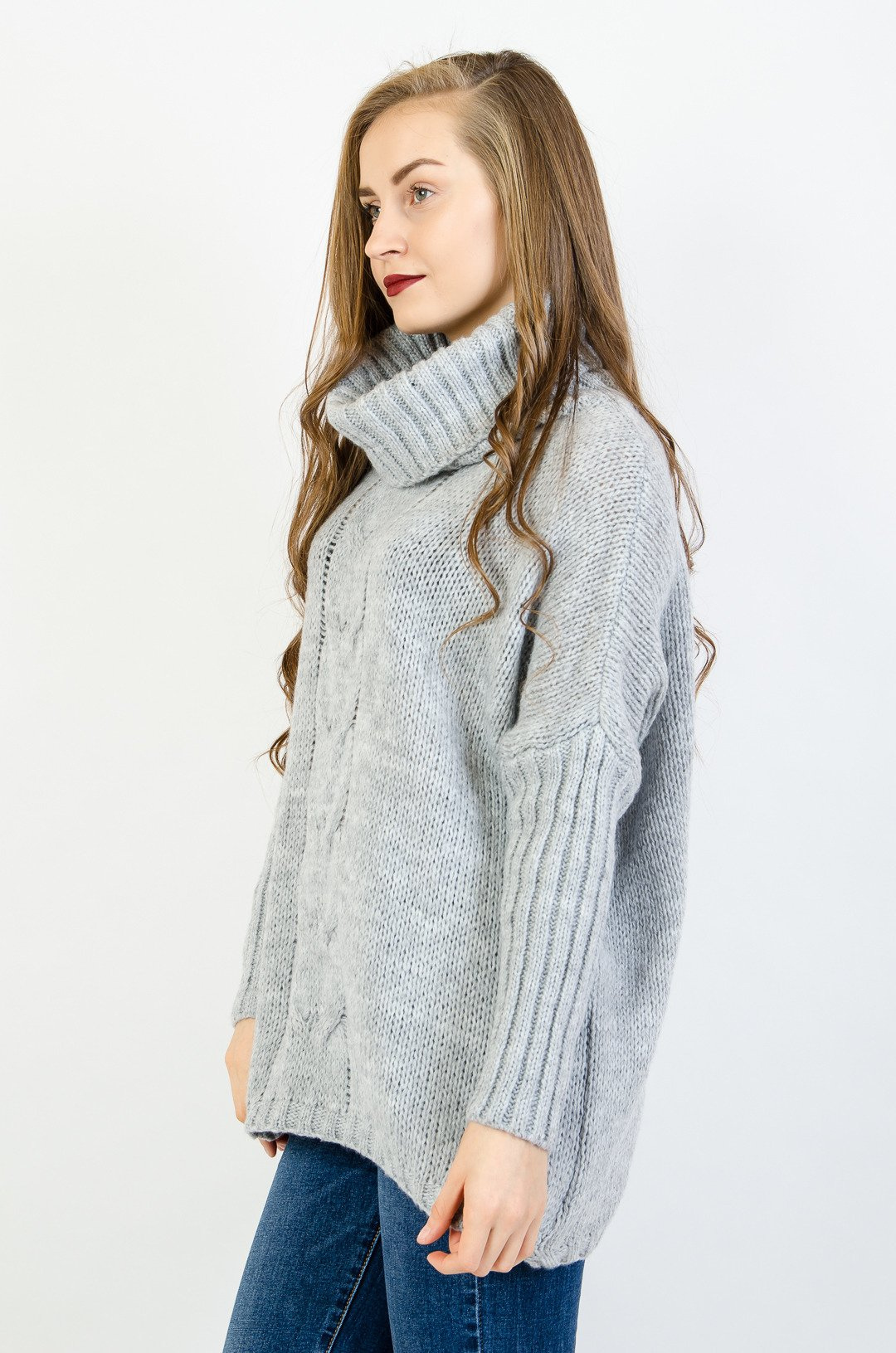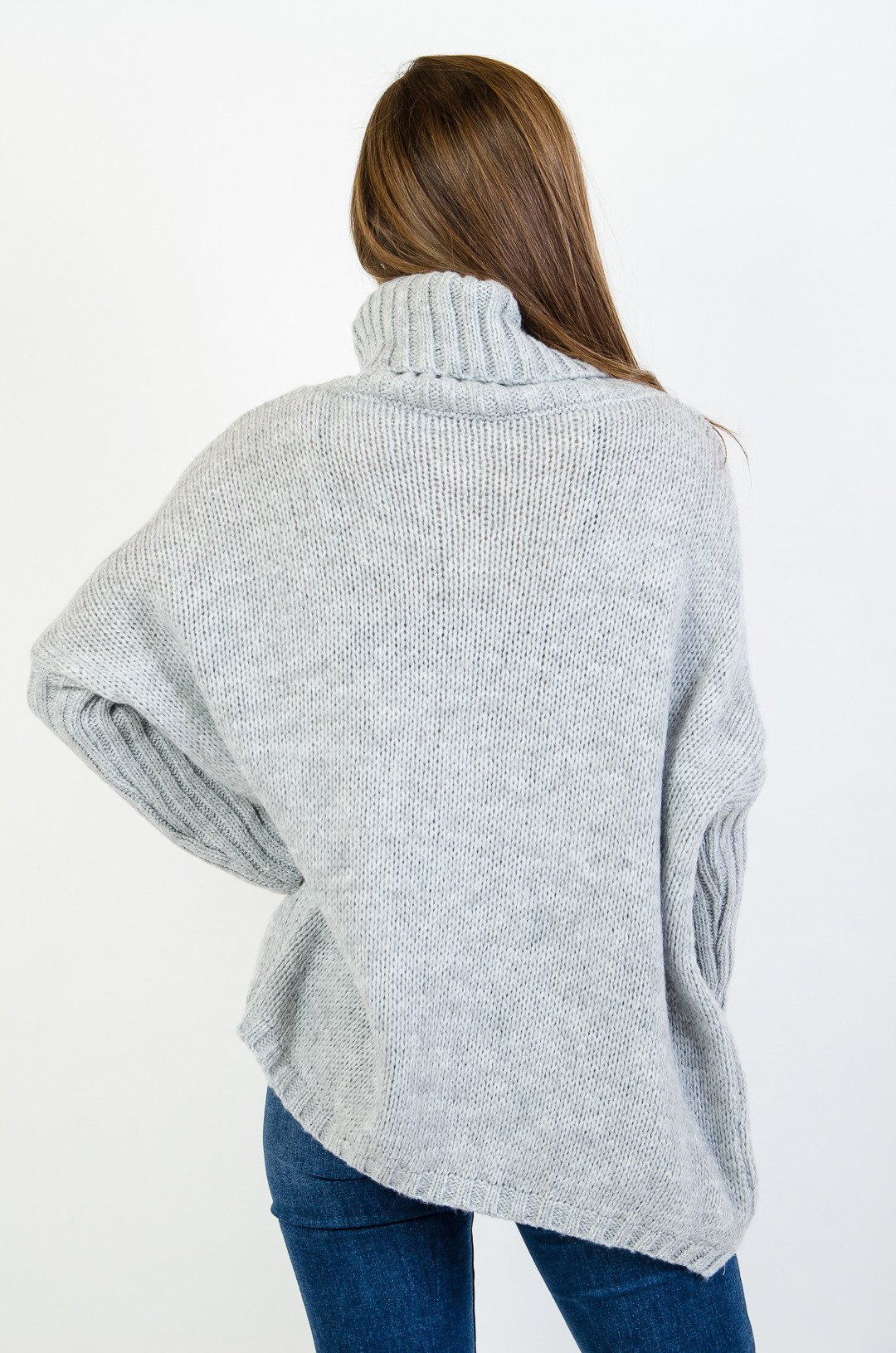 Szary asymetryczny sweter typu nietoperz z golfem