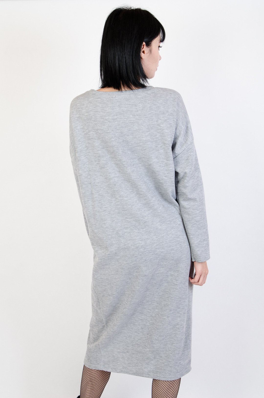 Długa szara dzianinowa sukienka z wiązaniem z przodu.
