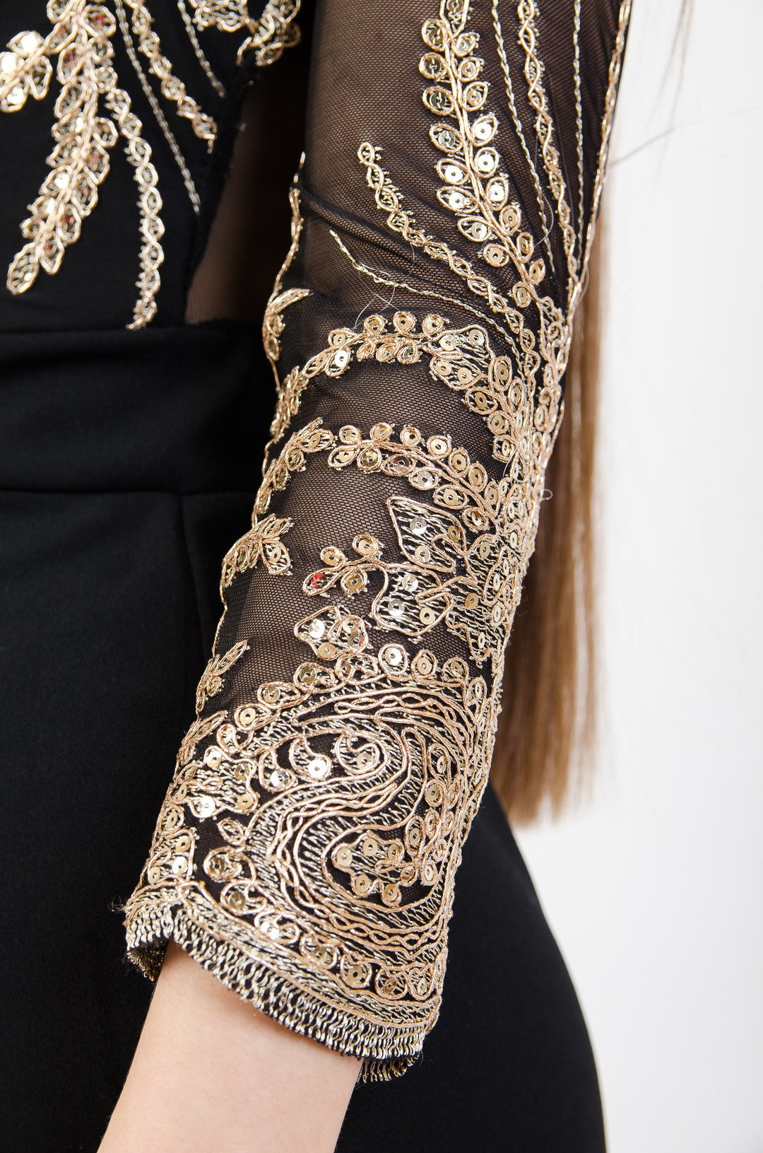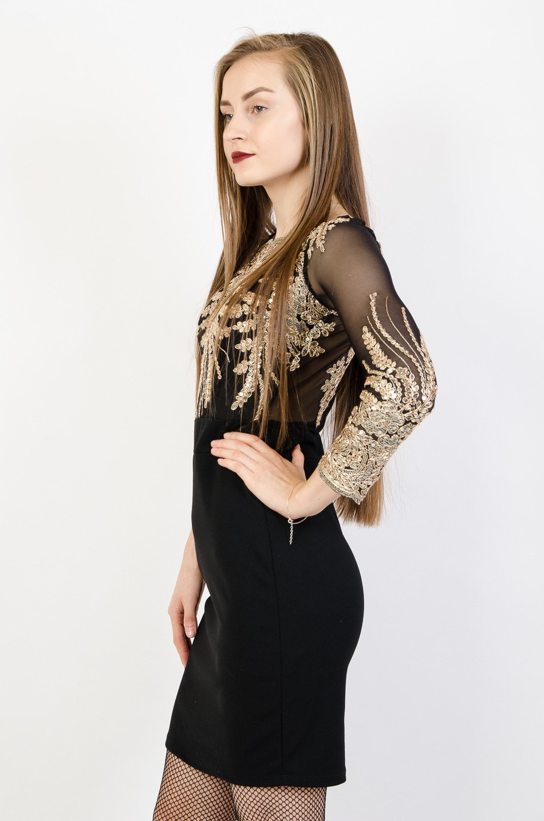 Czarna ołówkowa sukienka ze złotymi zdobieniami