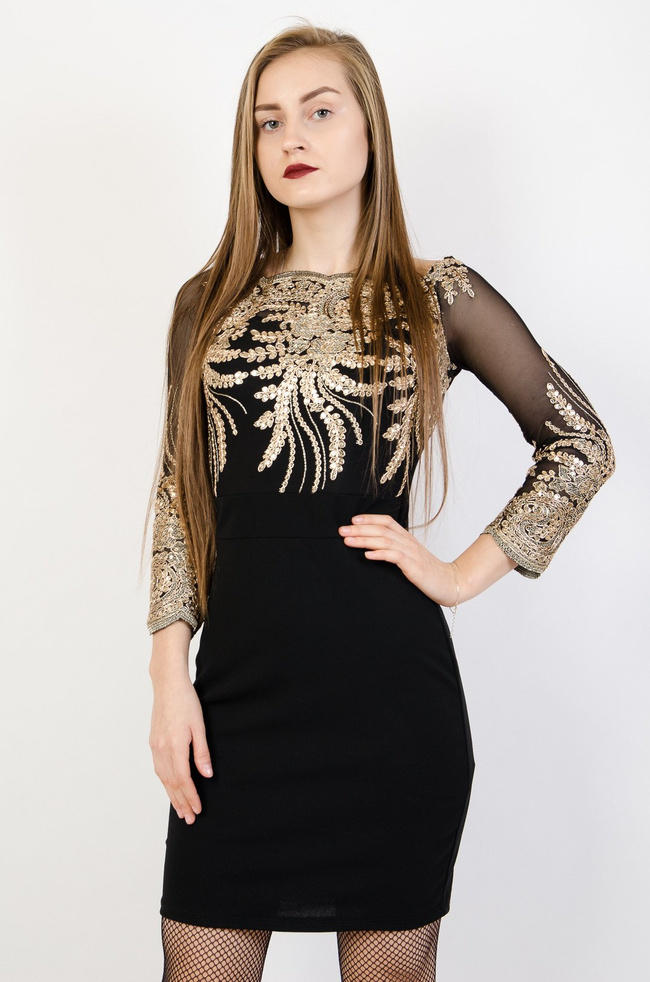 Czarna ołówkowa sukienka ze złotymi zdobieniami.