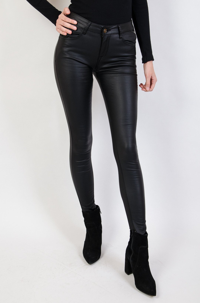 Czarne  spodnie woskowane z zamkami na kieszeniach z tyłu.